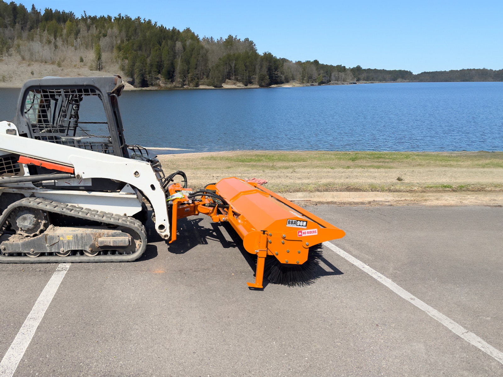 The Broce Broom angle broom attachments are designed to optimize performance and productivity, and are compatible with most skid steer models. Our angle broom attachment (BBA) is available in manual and hydraulic angle and are available in 48″, 60”, 72”, 84” and 96” widths. Our angle broom attachments are a perfect choice for parking lots, road shoulders, sidewalks, hiking trails, roadways and so much more.