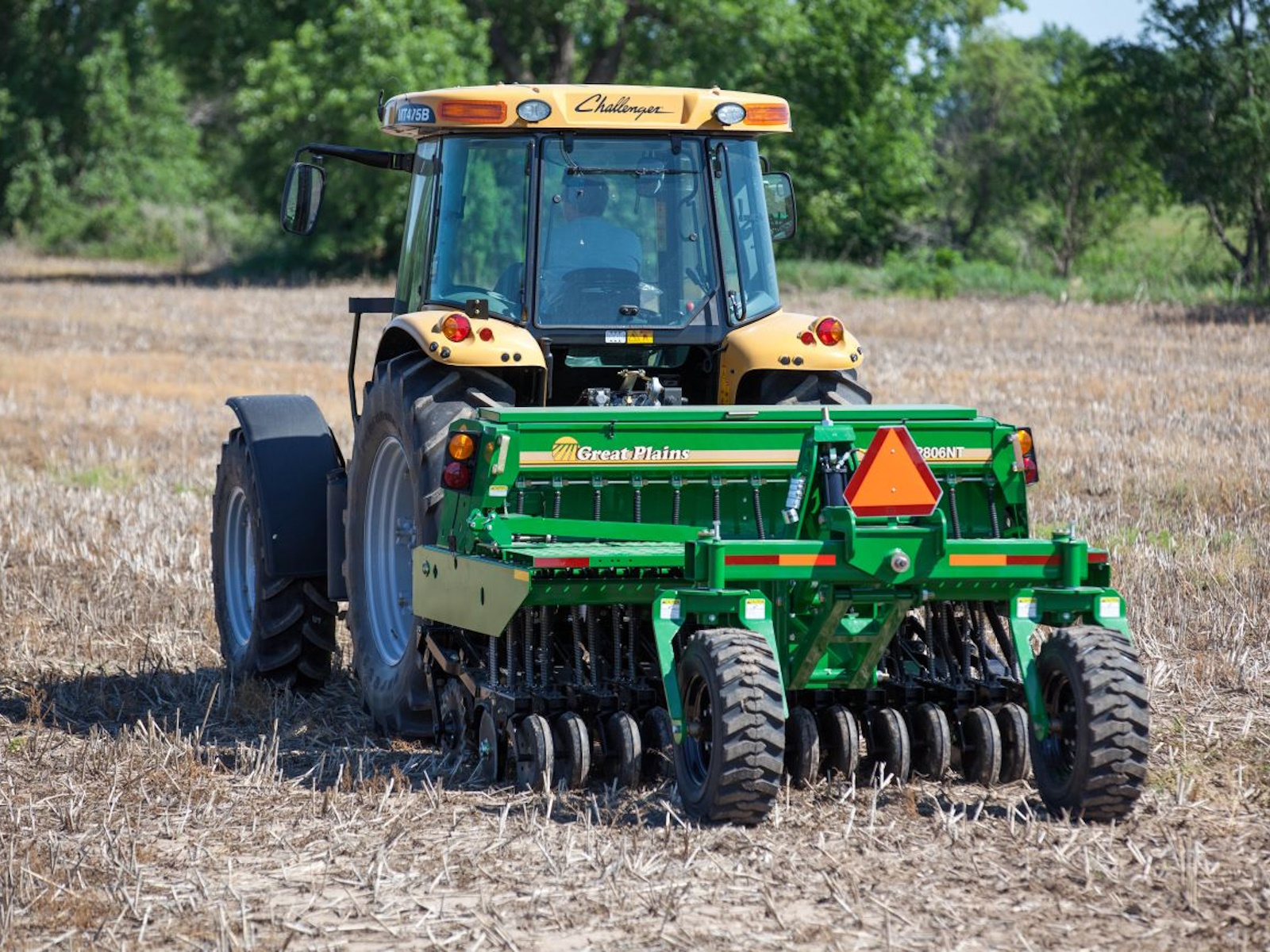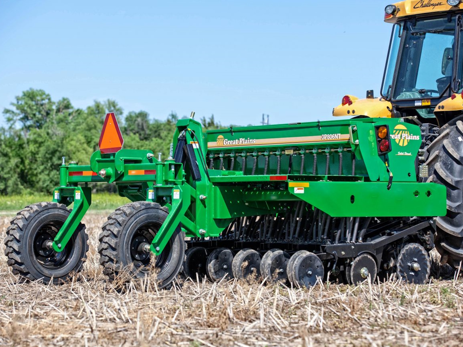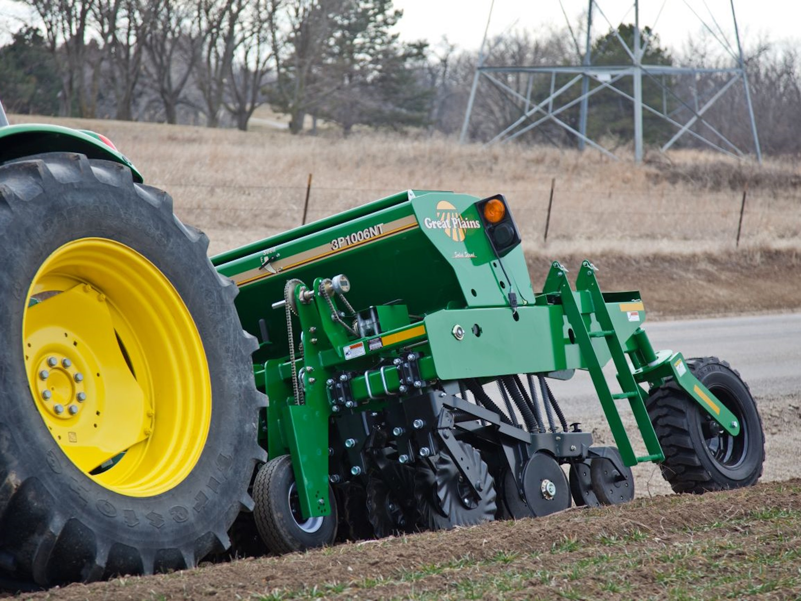The Great Plains 3P806NT and 3P1006NT are 2-point mounted no-till drills with lift assist wheels to ensure safe operation and transport.