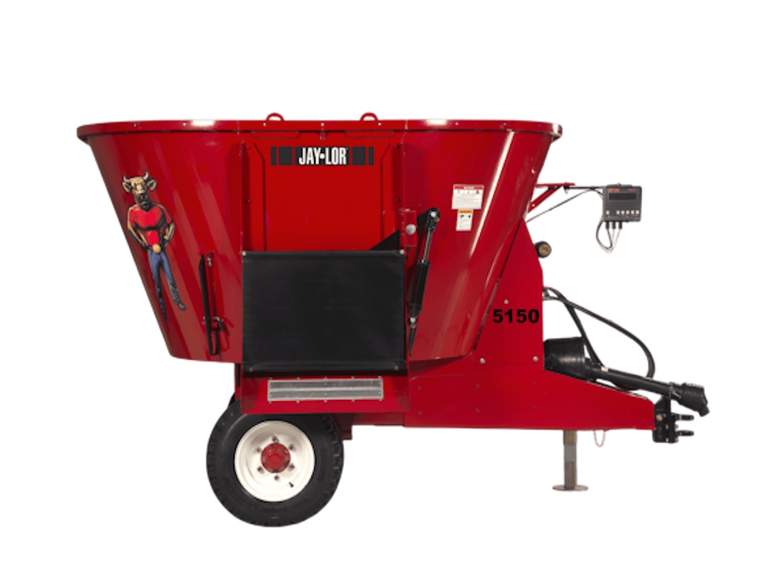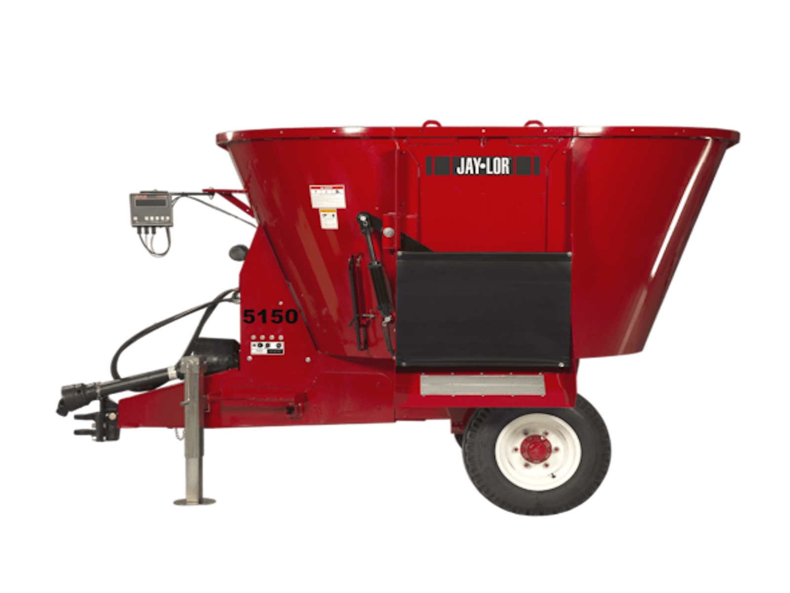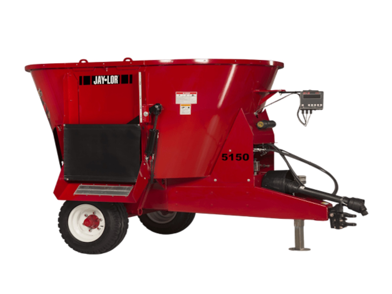 Your 35 HP (PTO) tractor is all you need to power the Jaylor 5150 Trailer Mini TMR Mixer! This compact yet powerful mixer creates a true Total Mixed Ration (TMR) by blending baled forage, silage, and additives into a uniform mix that resists sorting. Capable of processing and mixing a 4×4 round bale (600 lbs/275 kg hay equivalent) per load, or an equivalent portion of a larger bale, the 5150 Trailer Mixer delivers consistent, high-quality feed every time. Featuring a simple, reliable driveline, a planetary gearbox-powered auger, and unloading doors on the left, right, or both, it’s built for efficiency and versatility.