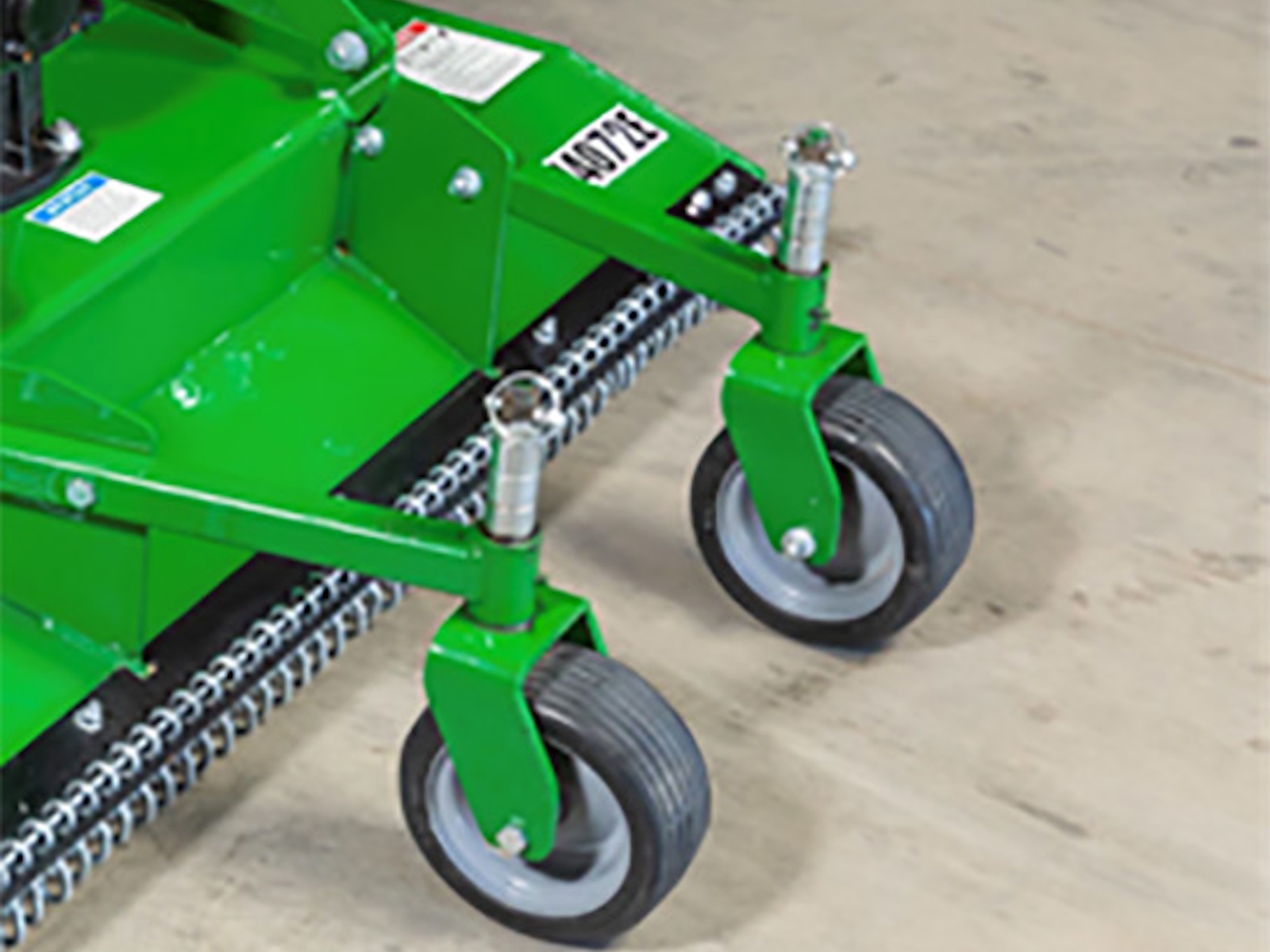 By having four caster wheels, the GM40E Series Grooming Mower follows ground contours and prevents scalping. Heavy tubular caster wheel arms are bolted to rail supports for long life.