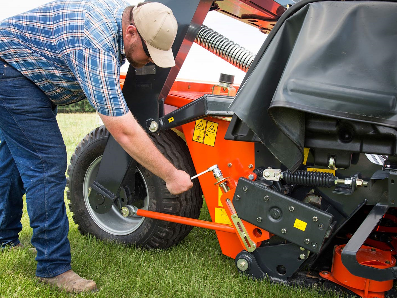 • A simple crank adjusts the whole cutterbar assembly up or down to a desired stubble height. Additional skids are available to increase cutting height.
