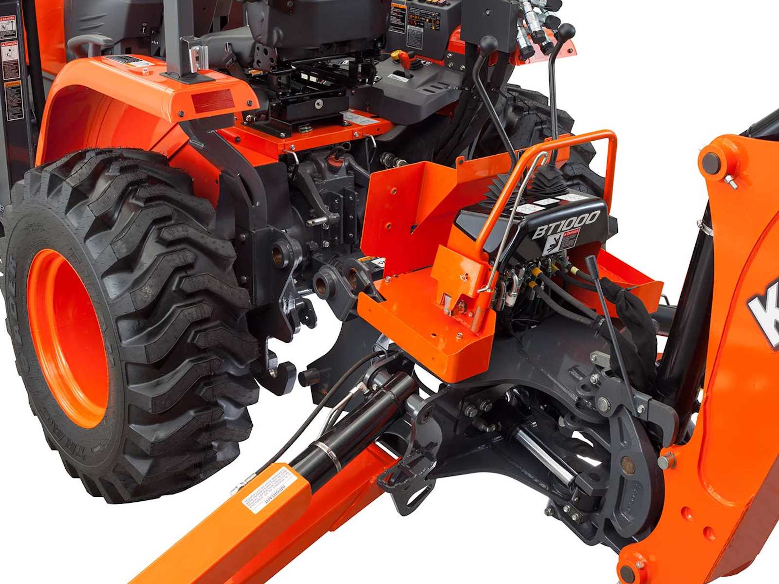 • The slanted boom and hood of the Kubota TLB improves visibility over the hood. This helps you change attachments and get back to work quickly; it also allows increased productivity in tight areas.