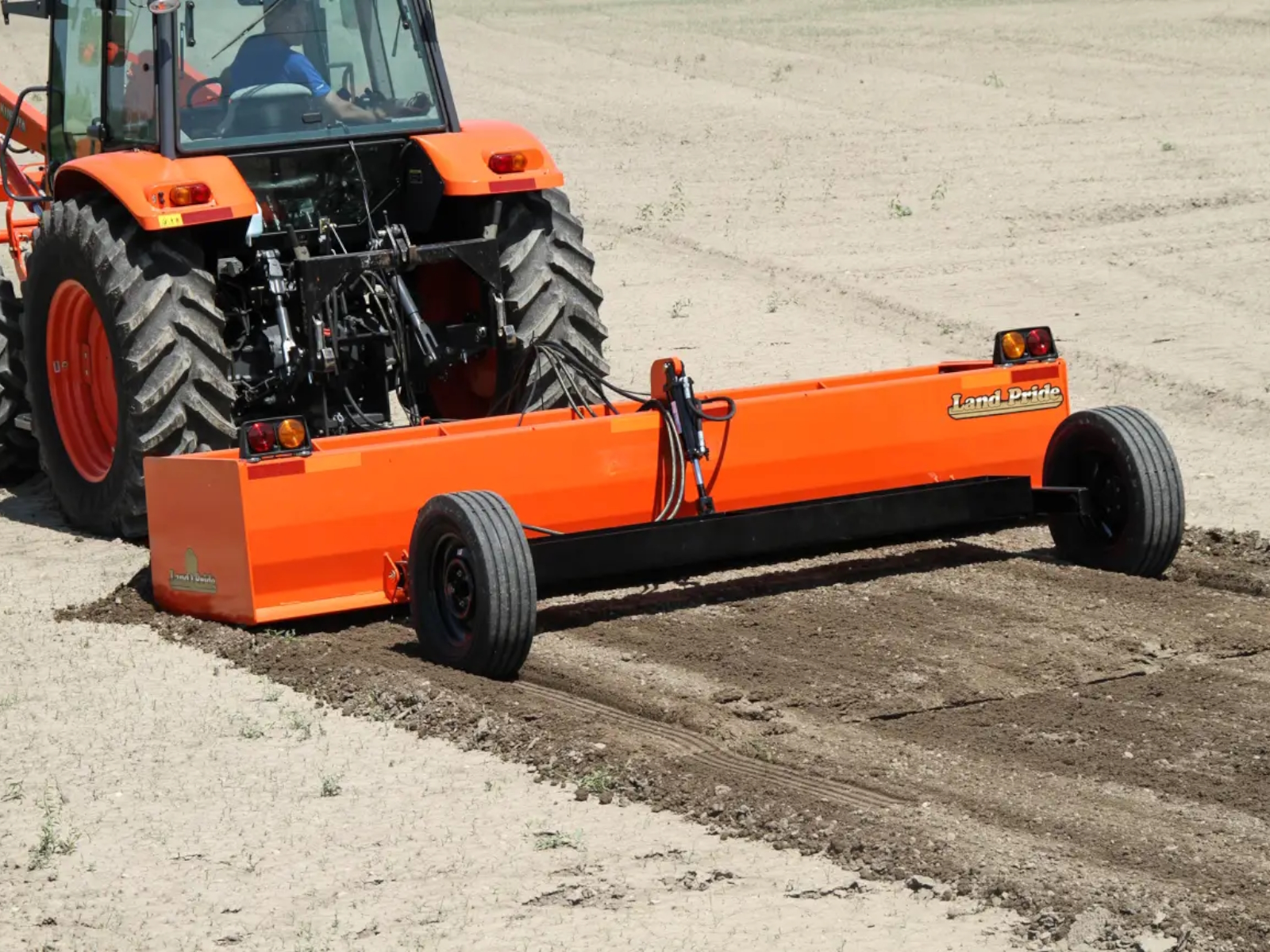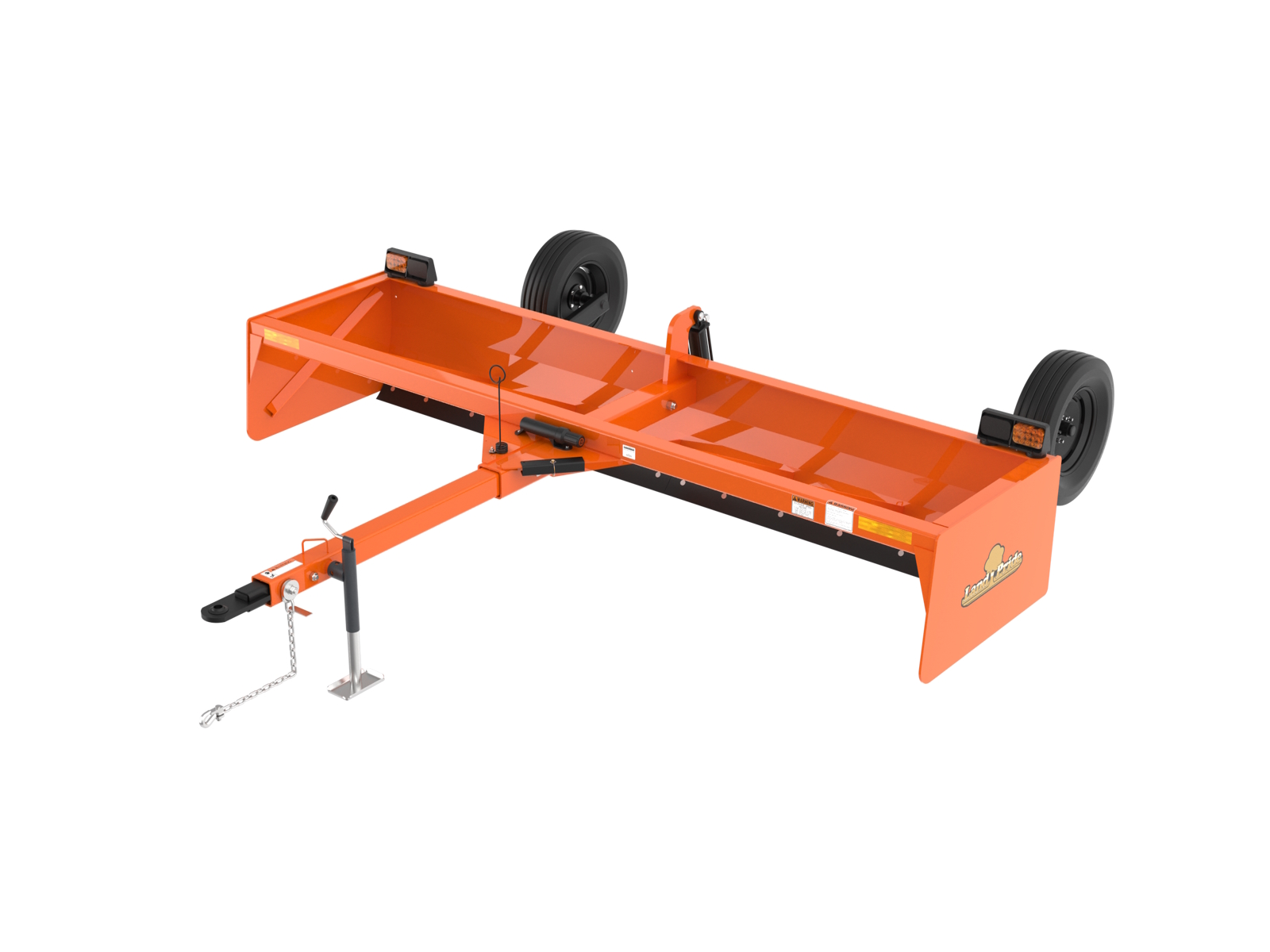 Land Pride BB45 Series Pull-Type Drag Scrapers, with standard fixed axle or optional tilt axle, are ideal for moving large quantities of material, leveling, and finish grading. Scrapers with the optional tilt axle can do everything the standard axle does, as well as remove material on an angle for sloping, terracing and ditching. Material can be transferred by dragging it to nearby locations and raising the scraper to deposit the load. Surfaces can be graded and leveled by scraping material from high areas and allowing accumulated material to flow under the grader blade in to lower areas.