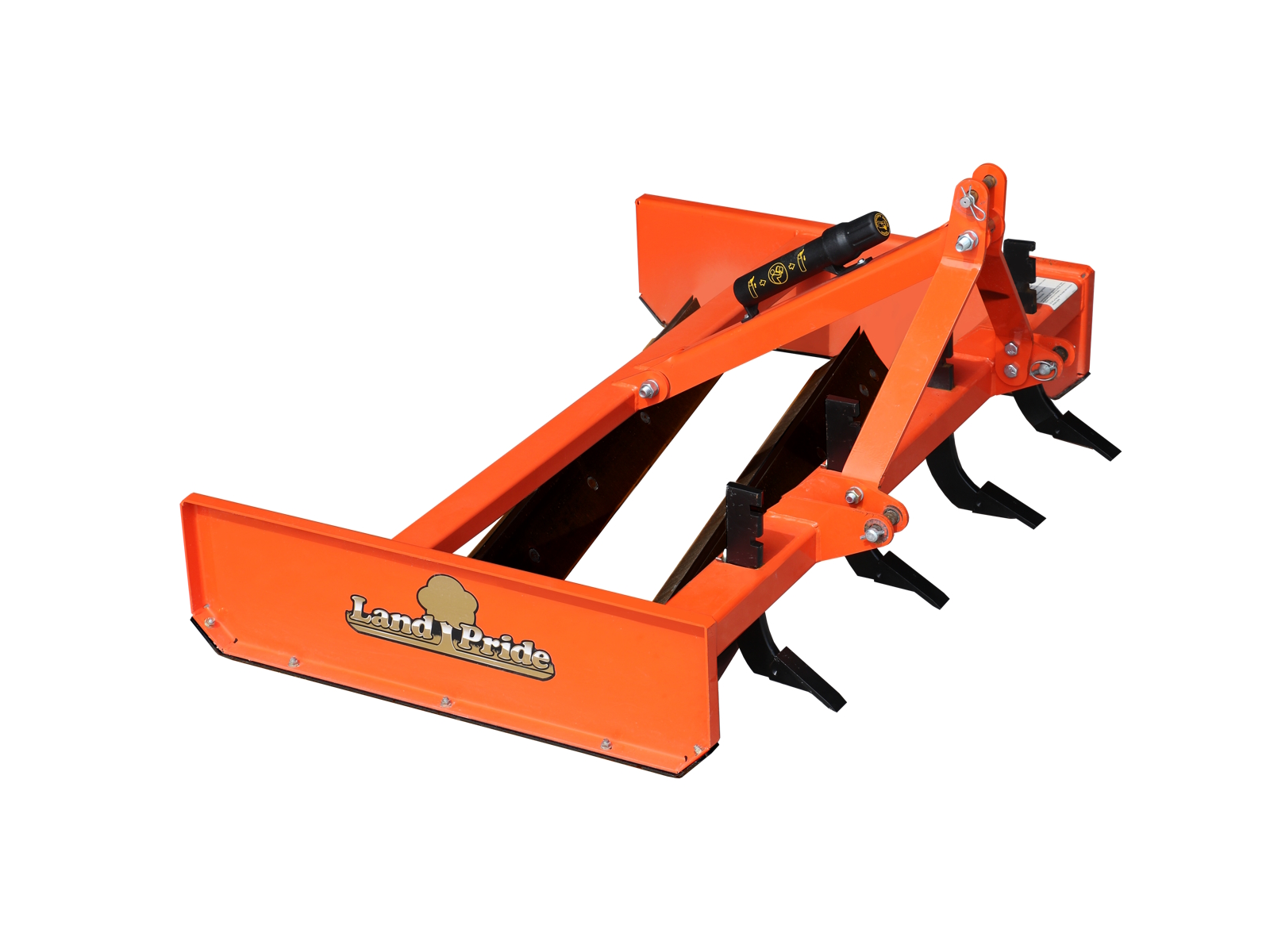 Color selections: Land Pride Beige or Orange | Hitch type: Category 1 and Category 1 Quick Hitch | Lower 3-point attachment: Clevis type | Shank adjustments: 3 3/4 in and 1 1/2 in (9.5 cm and 3.8 cm) below grade level. 1/2 in (13 mm) above grade level. | Grader blades: Two 3/8 in x 6 in (1.0 cm x 15.2 cm) high-carbon, heat-treated blades that are reversible and replaceable | Scarifier shank construction: Heat treated, 3-position shank with dimpled-on hardened tips. | Skid Shoe Dimensions: 1/4 in (6 mm) Thick x 1 1/2 in (3.8 cm) wide x 40 in (1.02 m) long. | Rear beam construction: 3 in x 2 in (7.6 cm x 5.1 cm) heavy wall tubing. | Front main beam & scarifier support: 4 in x 3 in (10.2 cm x 7.6 cm) reinforced heavy wall tubing. | Side panel thickness: 3/16 in (5 mm) thick with: 1 1/2 in (3.8 cm) formed edges. | Side panel thickness: 3/16 in (5 mm) thick with 1 1/2" (3.8 cm) formed edges. | Number of scarifier shanks: 4 | Weight without optional rear blades: 350 lbs (158.8 kg), Weight of optional rear blades: 70 lbs (31.8 kg)