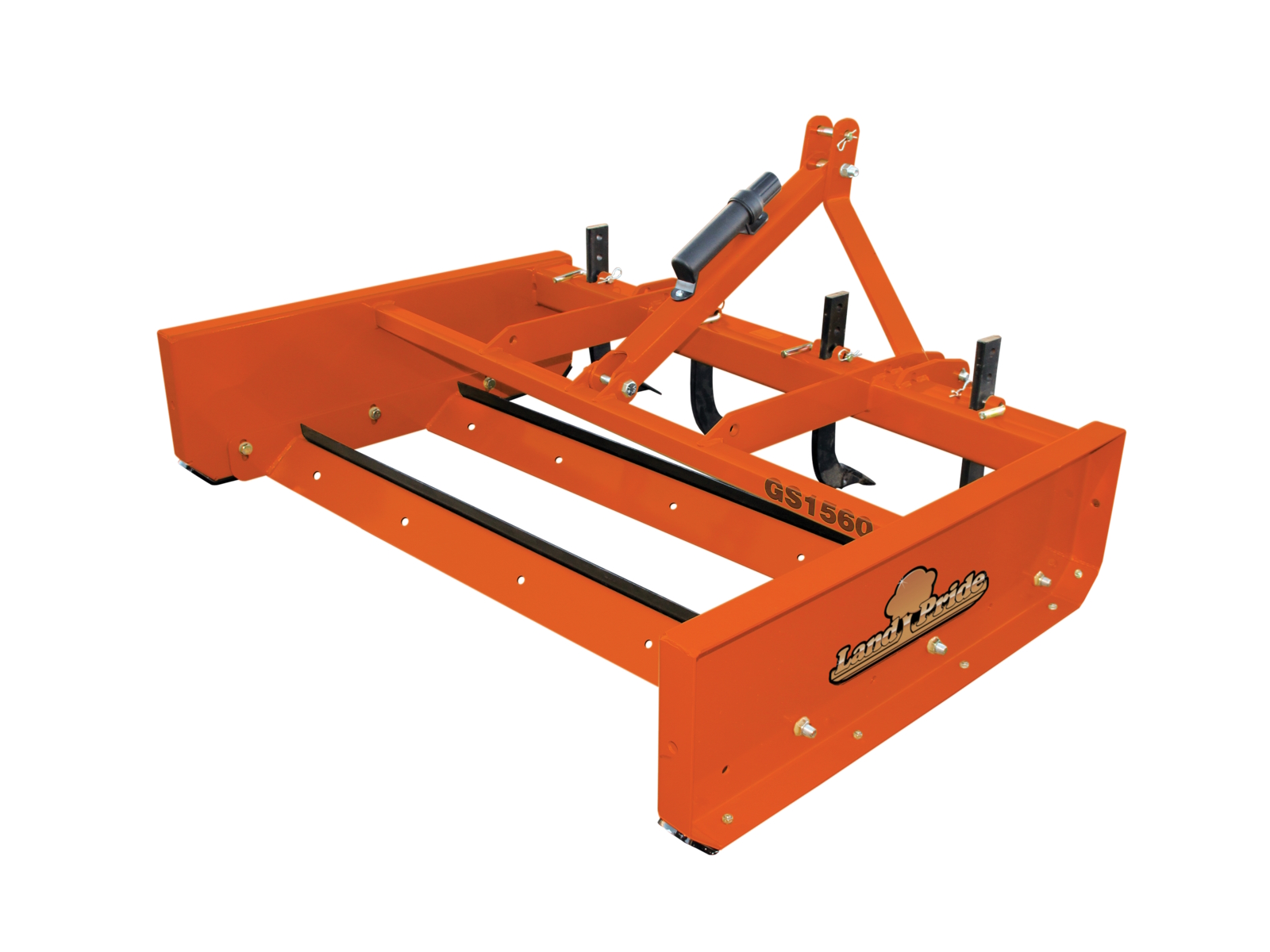 Color selections: Land Pride Beige or Orange | Hitch type: Category 1 and Category 1 Quick Hitch | Lower draft link attachment: Clevis type | Shank adjustments: 3 1/2 in and 1 1/2 in (8.9 cm and 3.8 cm) below grade level. 1/2 in and 2 1/2 in (1.3 cm and 6.4 cm) above grade level. | Cutting edge adjustment: Infinite vertical adjustment from level grade to 1 1/2 in (3.8 cm) below grade | Cutting edge placement: Two parallel grading blades positioned at a 5 degree grading angle with 17 1/2" (44.5 cm) fore and aft spacing in between leading edges | Cutting edges: Two 1/2 in x 6 in (1.3 cm x 15.2 cm) high carbon heat treated blades that are reversible and replaceable. | Scarifier shank construction - Optional: Heat treated 4-position shank with dimpled-on hardened tips. | Skid shoe dimensions: 3/8 in (10 mm) Thick x 2 3/4 in (7.0 cm) wide x 44 in (1.12 m) long. | Rear beam construction: 2 in x 2 in x 3/16 in (5.1 cm x 5.1 cm x 0.5 cm) Heavy wall tubing | Front main beam & scarifier Support: 4 inx 4 in x 5/16 in (10.2 cm x 10.2 cm x 0.8 cm) | Number of scarifier shanks: 4 | Side panel thickness 3/16 in (5 mm) Thick with 2 3/4 in formed edges