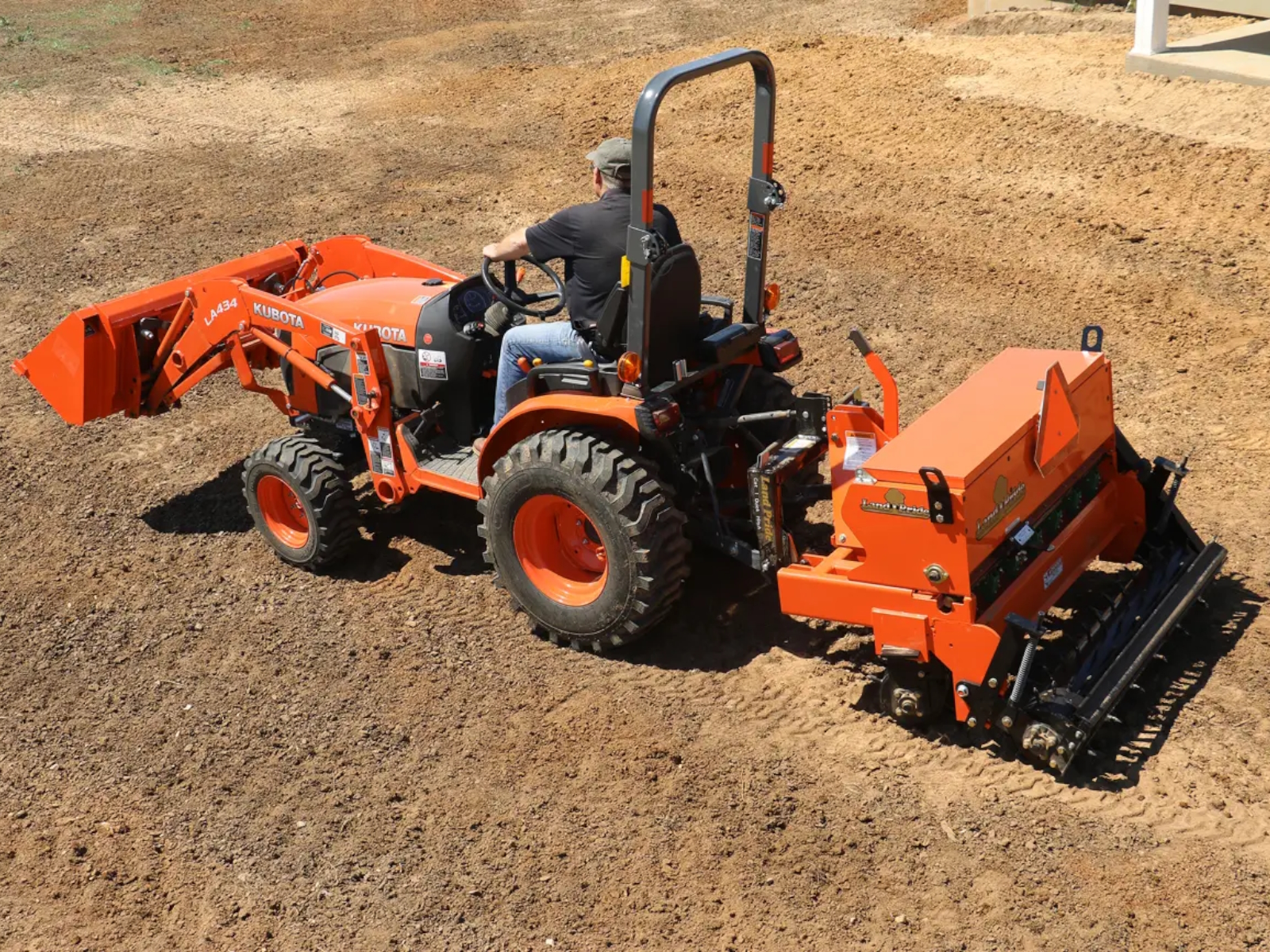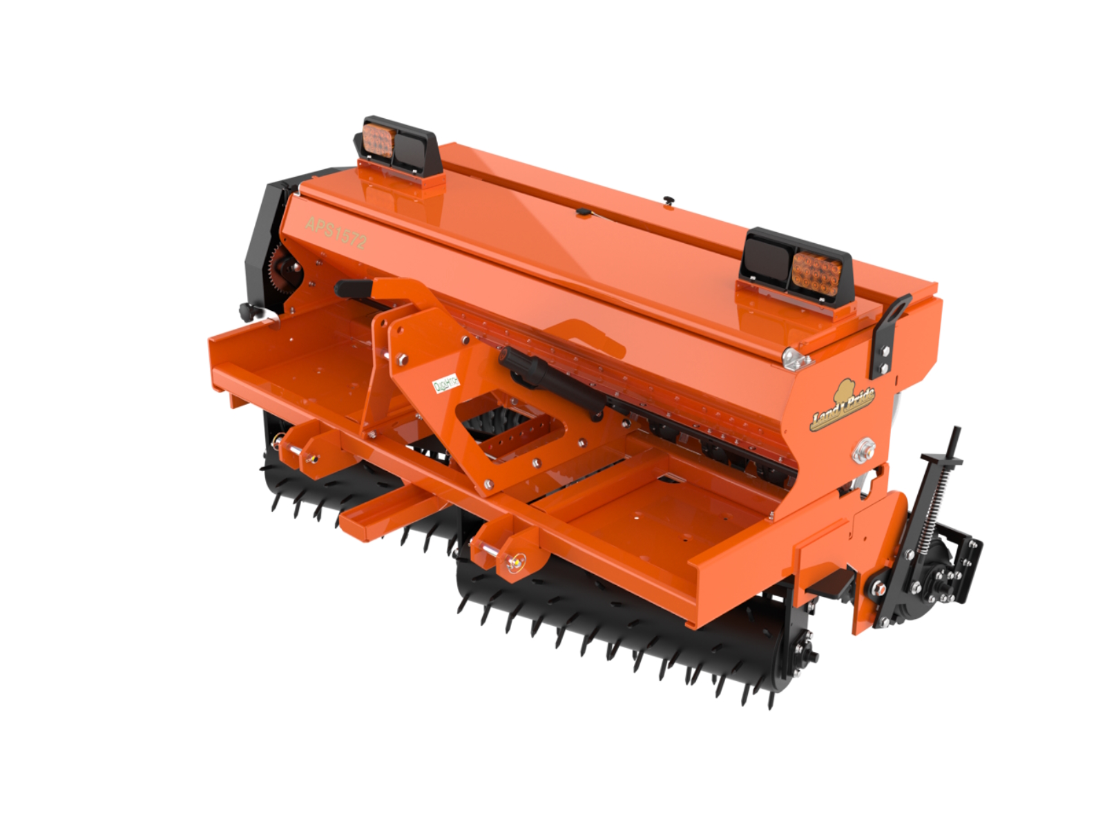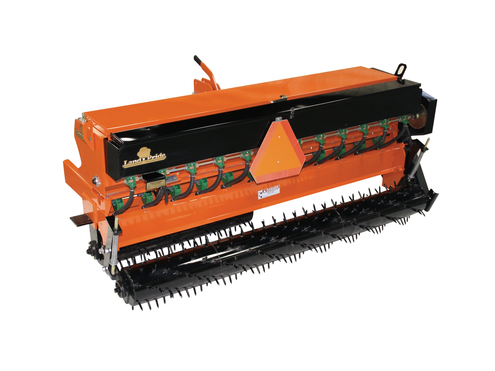 Mud Scrapers Option: Bolt on mud scrapers for front and rear spiked rollers, Bolt on mud scrapers for front spiked rollers & rear packer roller | Roller Spike Size: 1 1/2 in (3.8 cm) x 1/2 in (13 mm) | Rear Roller Mounting: Spring loaded mounted on 1 in (2.5 cm) sealed greasable bearings | Rear Roller Option: Straight 8 in (20.3 cm) diameter spiked roller Straight 11 9/16 in (39.4 cm) diameter cast notched packer rings | Front Rollers: Two 8 in (20.3 cm) Diameter spiked rollers capable of angling from 0 to 20 degrees each and mounted on 1" sealed greasable bearings | Seed Cup Drive: Metering rear roller ground drive with spring loaded #40 roller chain, high/low speed change sprocket, spring tensioned idler & seed drive shut-off pin | Seed Cup Settings: Wide range of calibration settings: Weight per acre, per 1000 square feet, per hectare, and per 1000 meters | Seed Box Lid: Heavy duty lid with seed splash guard | Seed Box: Water tight with paddle type agitating above seed cups | Seed Drop: Wind Guarded | Seed Cup Door: Four position door for different seed sizes and complete clean out of seed cup | Seed Cup Type: Fluted for accurate metering | Number of Seed Cups: 7 | Seed Capacity: 1 Bushel (35.2 liters) per Foot (30.5 cm) of seedbox, 4 bu. (141 L) | Hitch: Category I Formed A-frame plates; Fits Land Pride Quick Hitch
