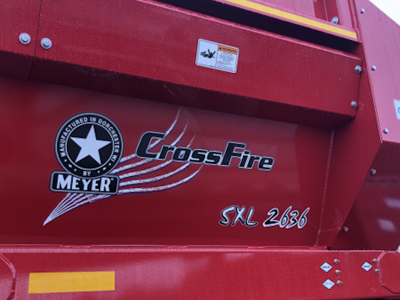 The New Meyer Crossfire Series V-Spreader combines the technology and performance of our Industrial Series models into a smaller configuration to give you maximum performance in the 260 - 540 bushel range. Our unique Rear Discharge System is unlike all others, incorporating a pantented rear discharge system with two shaft-driven vertical expellers for premium spread performance. The expellers are fed by an aggressive 3-auger system which powers through pack manure, semi solids, sand sludge, slurry, litter, biosolids, and certain lime and compost products. Rear Discharge keeps your tractor and spreader clean while maximizing the value of the product you are applying - it just makes sense! THE NEW CROSSFIRE MODELS REPLACE THE FORMER V-