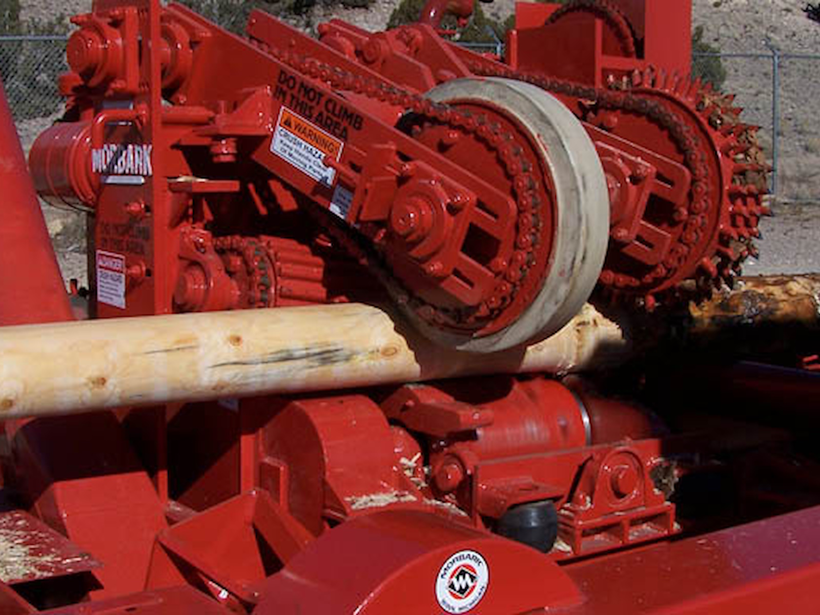 The Morbark C Series Debarkers will debark logs from 4" to 24" (10.2 cm – 61 cm) in diameter and up to 70' (21.3 m) in length. Using the Morbark Debarking Principle, the C series is effective in debarking hardwood and softwood, including stringy species, making it popular in cedar mills. To process logs end to end, a unique infeed rollcase allows the operator to load a log onto the infeed table while another is being debarked. This Debarker is built with hourglass rollcase-type infeed and outfeed conveyors. All functions are controlled from the operator's cab. The machine's hydraulic system is sufficient to power most infeed decks and debarker waste conveyors. This unit is generally used in barn pole, fence post and log home industries.