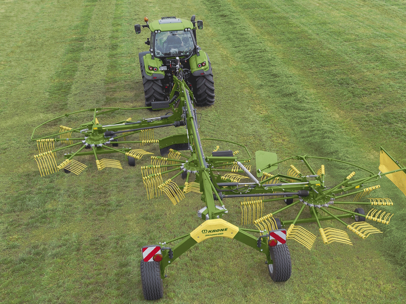 The KRONE Swadro S and TS line-up of rotary rakes offers the largest choice of side delivery rakes in the market. Our programme comprises an unmatched number of models and variants – from the single-rotor rakes for non-contiguous fields all the way up to the Swadro TS 970, the world’s most unique three-rotor rake for maximum productivity and harvester capacities.