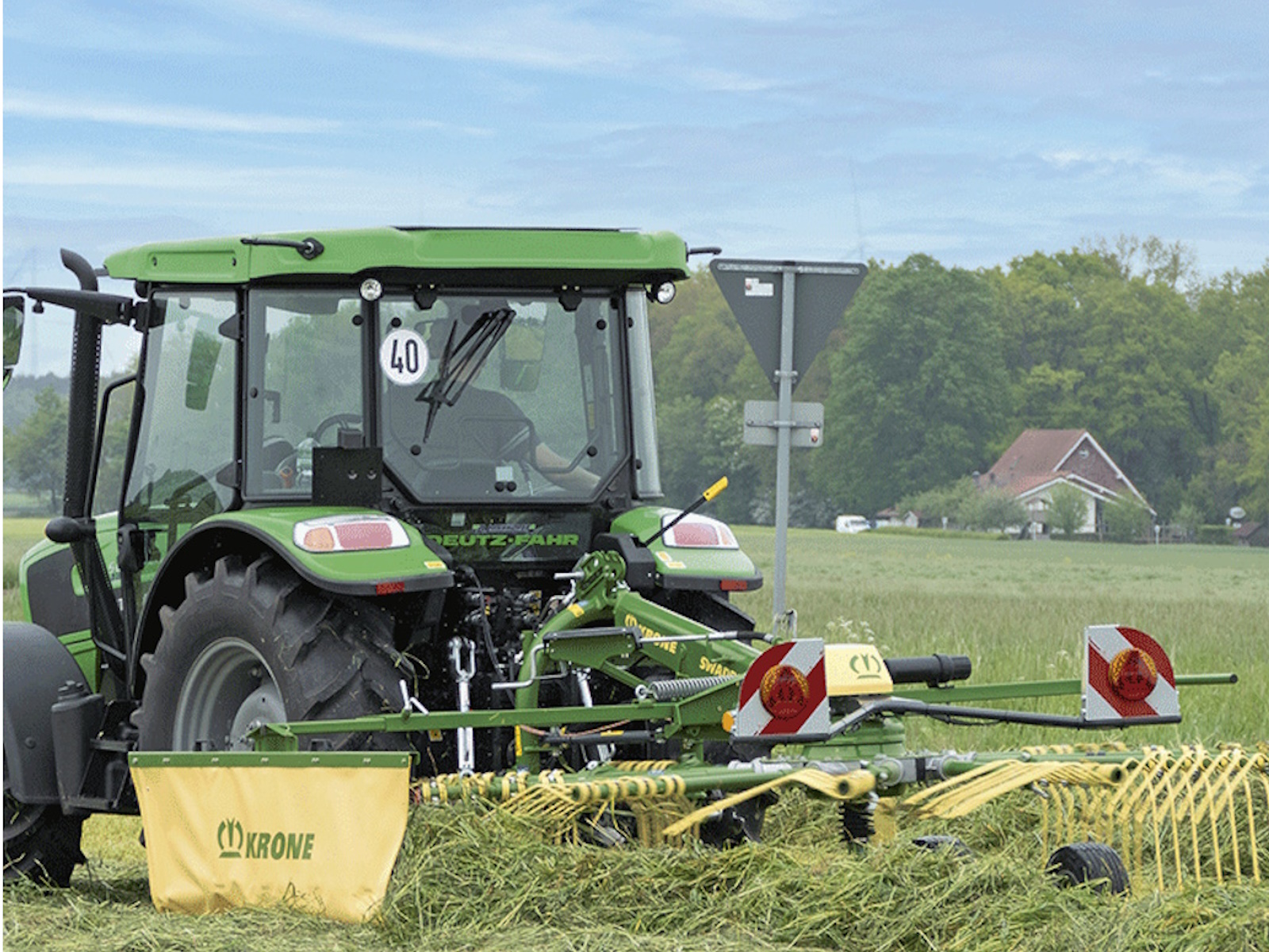 The trailed KRONE Swadro TS side-delivery rakes work at widths between 6.20 m (20'4") and 7.40 m (24'3") presenting the crop in single and double swaths. The Twin version forms twin swaths as standard specification. As a result, the machine covers work widths between 6.92 m (22'8") and 8.20 m (26'11").