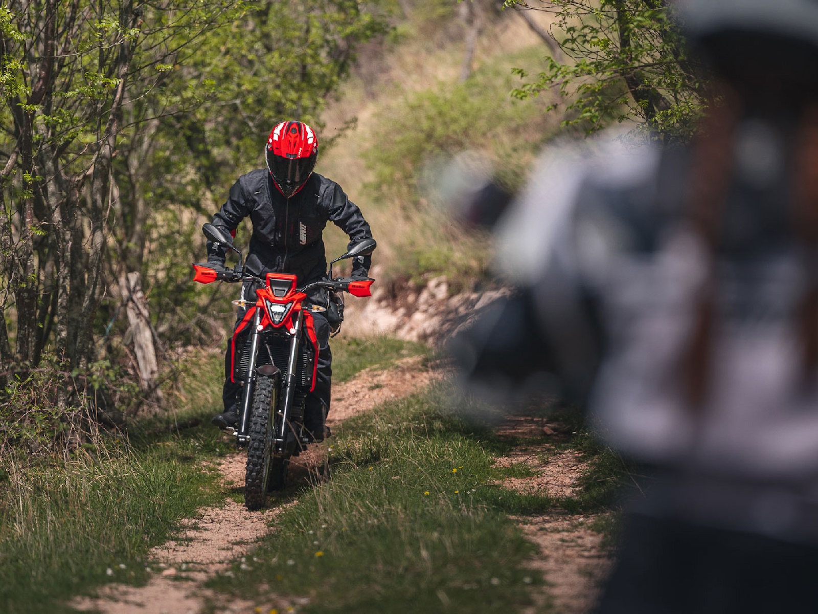 What stands out the most about these two models is their performance on and off-road, with the low center of gravity, more rugged trails can be tackled while at the same time on the road, they run very smooth. A bike for almost all conditions, unlike other adventure bikes that feel very top-heavy and awkward off-road. While most other adventure bikes are 80% road/20% street, the Alp models are more 50/50. Each model will be offered in two colors, red or white for the Alp 4.0 and a dark or light gray for the Alp X.
