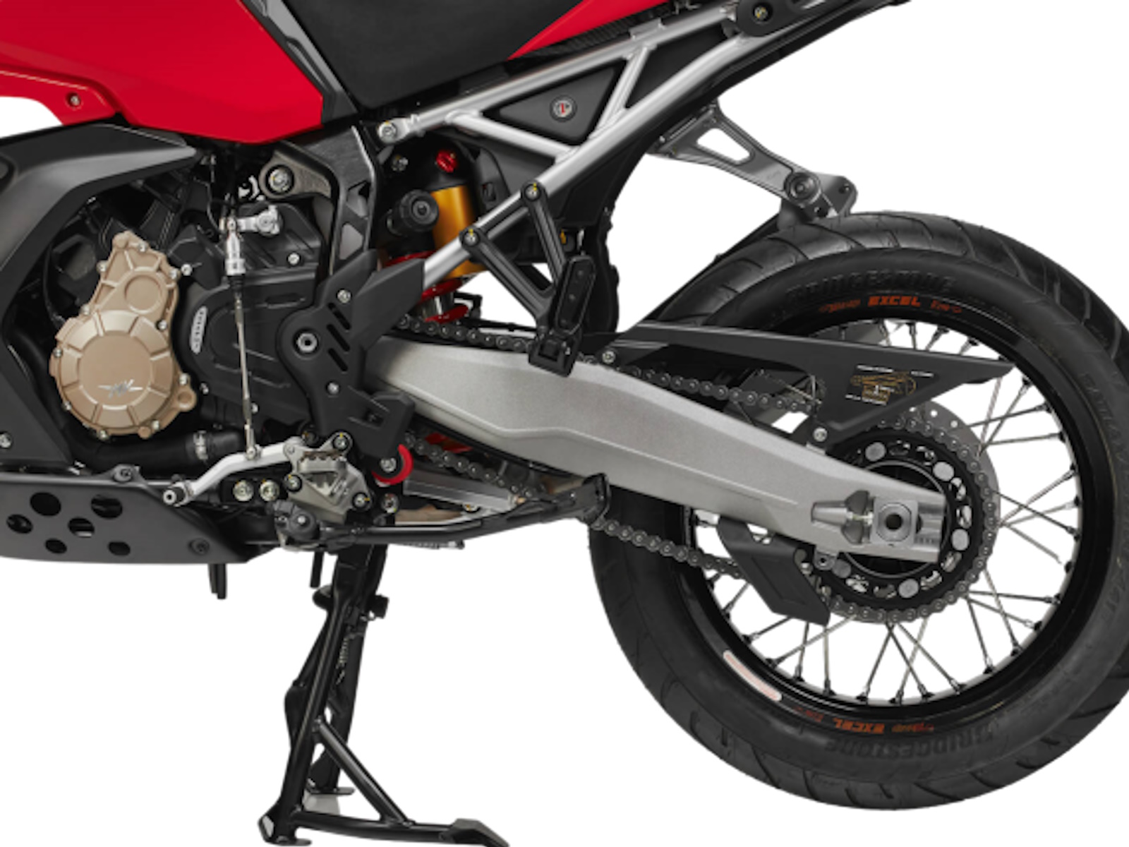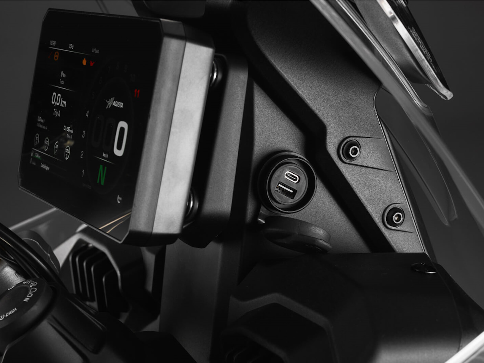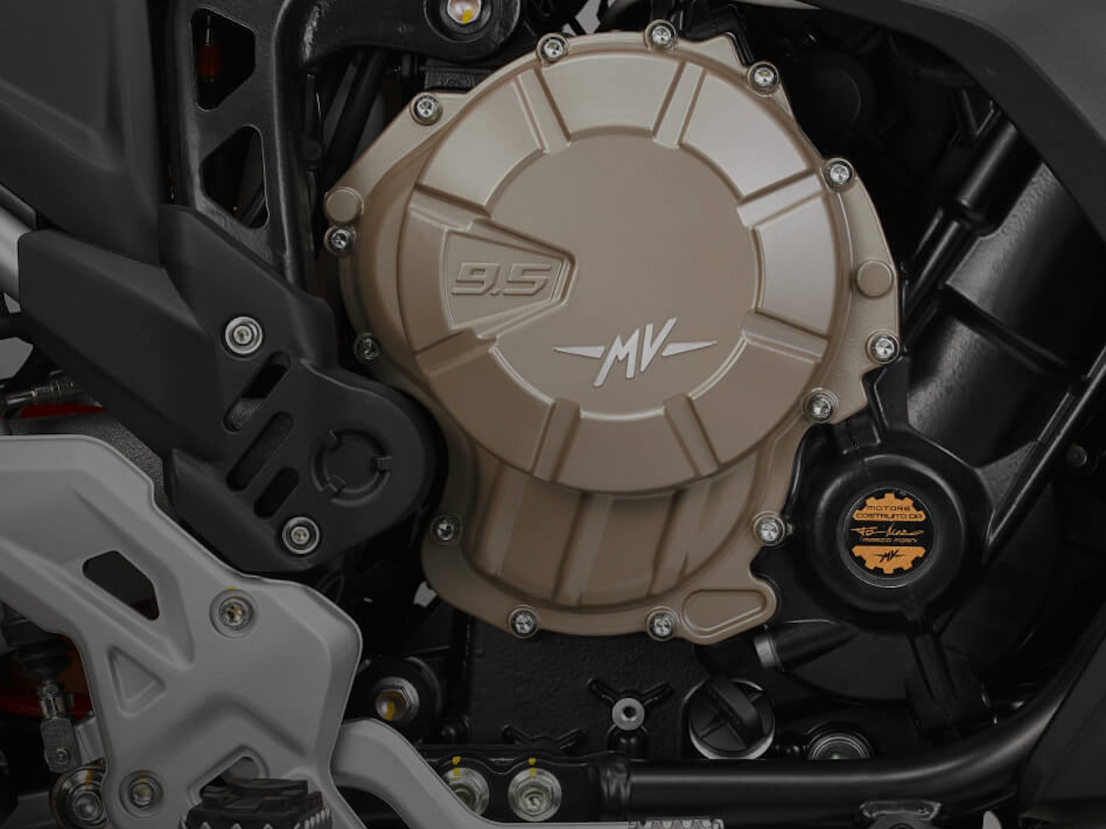 The new 931 cc engine boasts an iconic technical solution seen on all-new generation MV Agusta in-line three-cylinders: the counter-rotating crankshaft. Designed, developed, and built entirely at the firm's factory, the engine stands out for its lightness, weighing in at just 57 kg, and extreme compactness. With a gyroscopic effect that essentially cancels out that of the front wheel, the counter-rotating crankshaft allows for particularly rapid changes in direction. The engine delivers a maximum power of 124 hp at 10,000 rpm and 102 Nm of torque at 7,000 rpm.