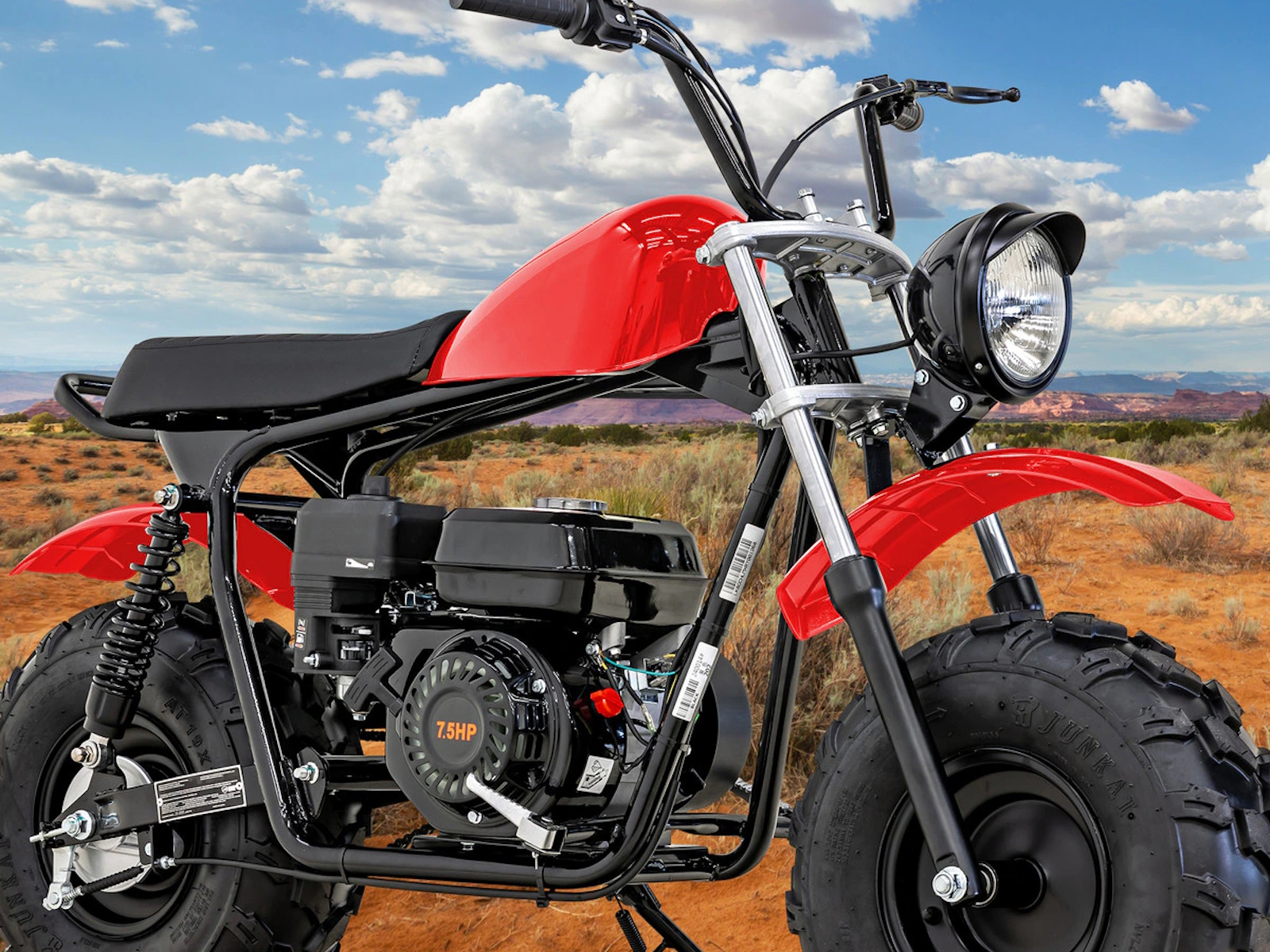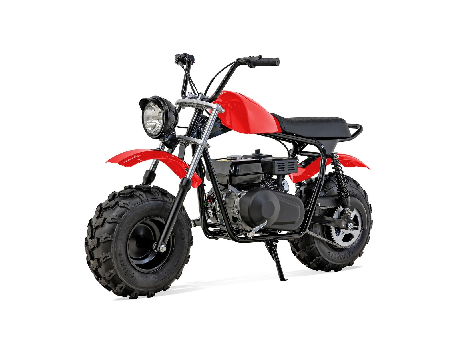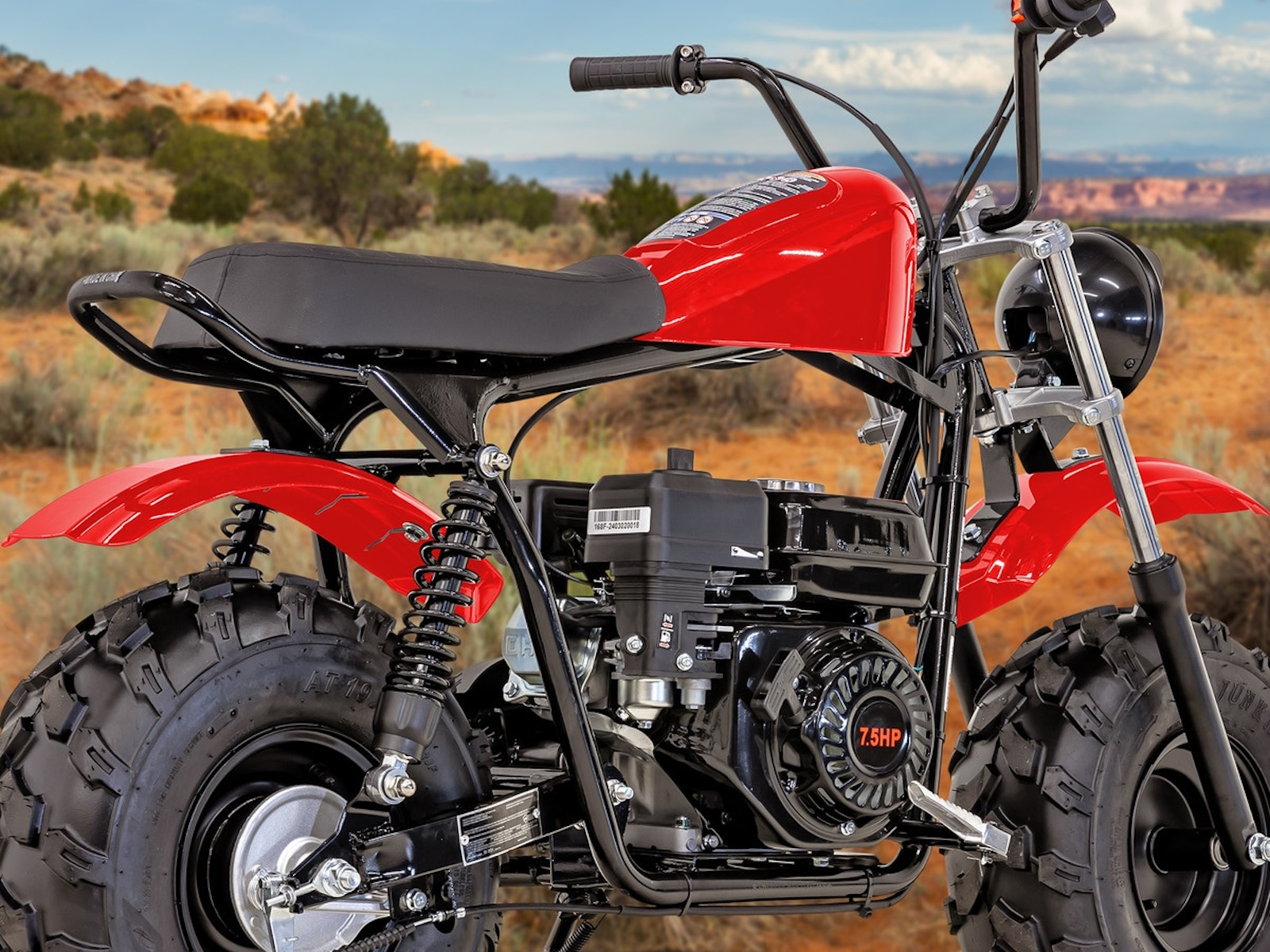 Get ready for off-road fun with the Massimo 200S Mini Bike, a modern classic built for adventure. It’s powered by a rugged and reliable 196cc, 7.5 HP engine and features a smooth dual-shock rear suspension for a comfortable ride on tough trails. This mini bike boasts super-wide 19-inch all-terrain tires that provide excellent grip and stability on dirt, grass, and pavement. With its low seat height, easy pull-start, and a faux gas tank for convenient storage, the 200S is the perfect choice for riders seeking a simple, durable, and thrilling off-road experience.