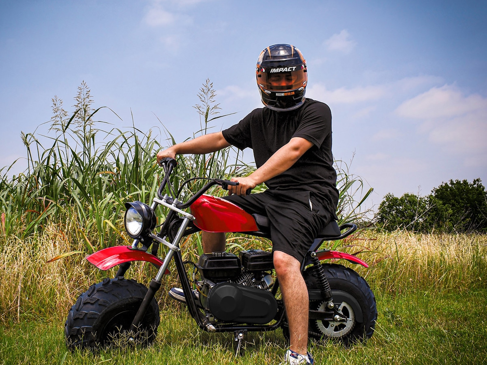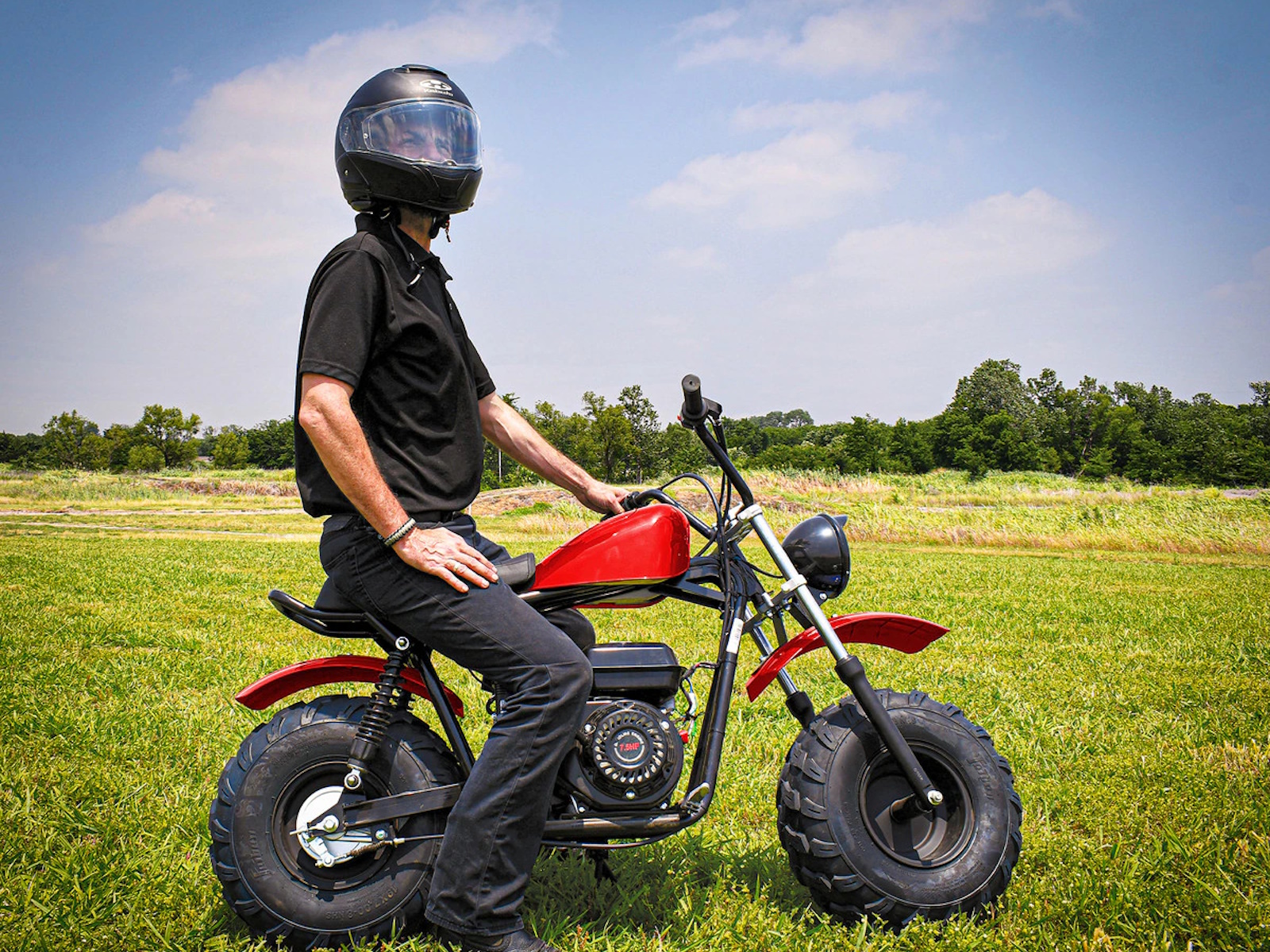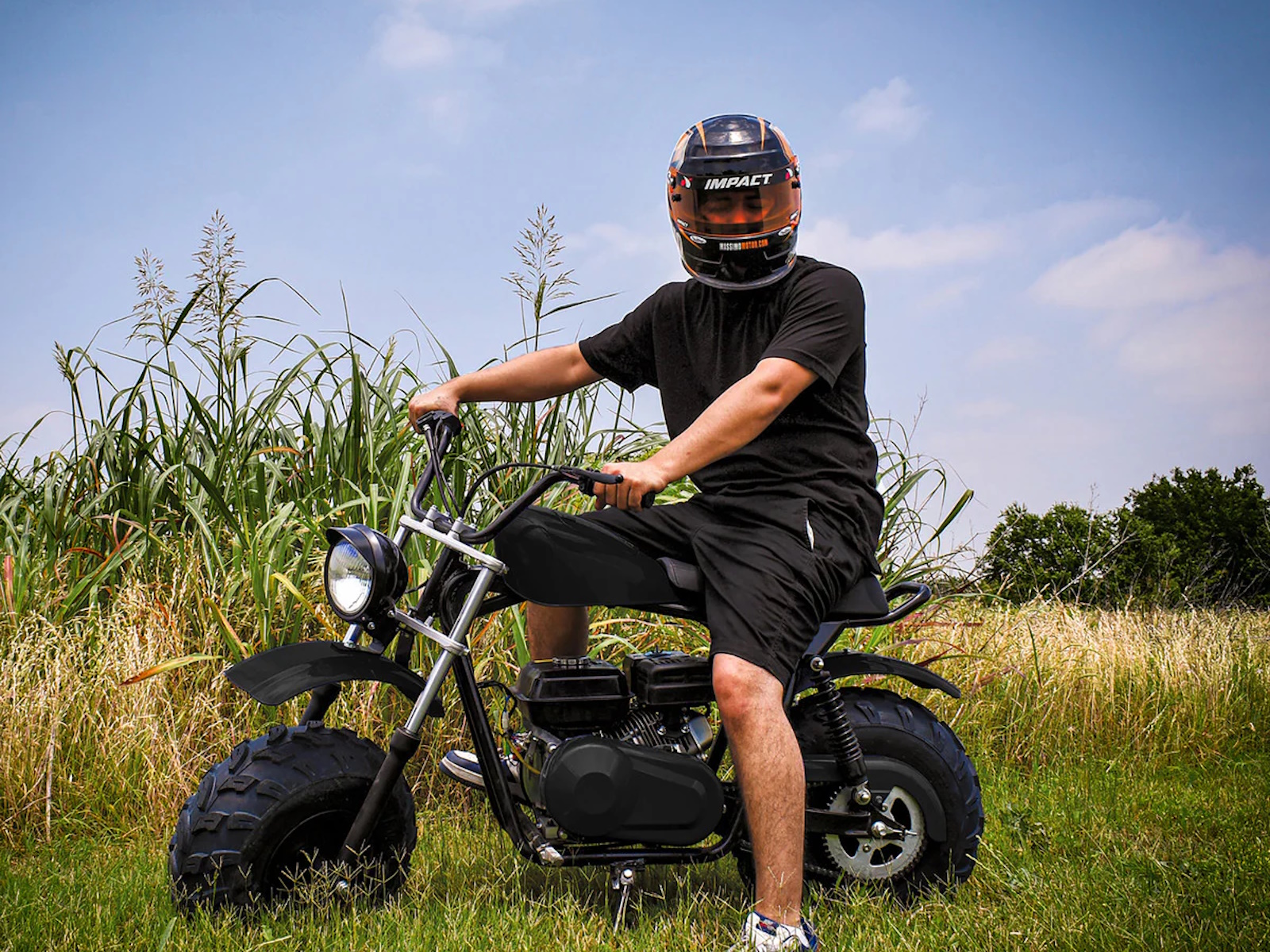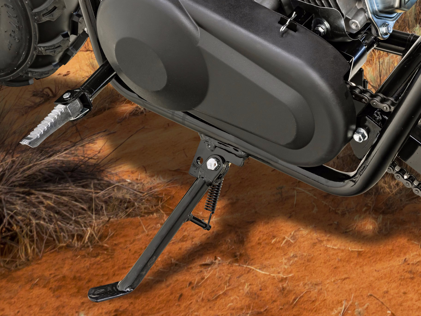 Get ready for off-road fun with the Massimo 200S Mini Bike, a modern classic built for adventure. It’s powered by a rugged and reliable 196cc, 7.5 HP engine and features a smooth dual-shock rear suspension for a comfortable ride on tough trails. This mini bike boasts super-wide 19-inch all-terrain tires that provide excellent grip and stability on dirt, grass, and pavement. With its low seat height, easy pull-start, and a faux gas tank for convenient storage, the 200S is the perfect choice for riders seeking a simple, durable, and thrilling off-road experience.