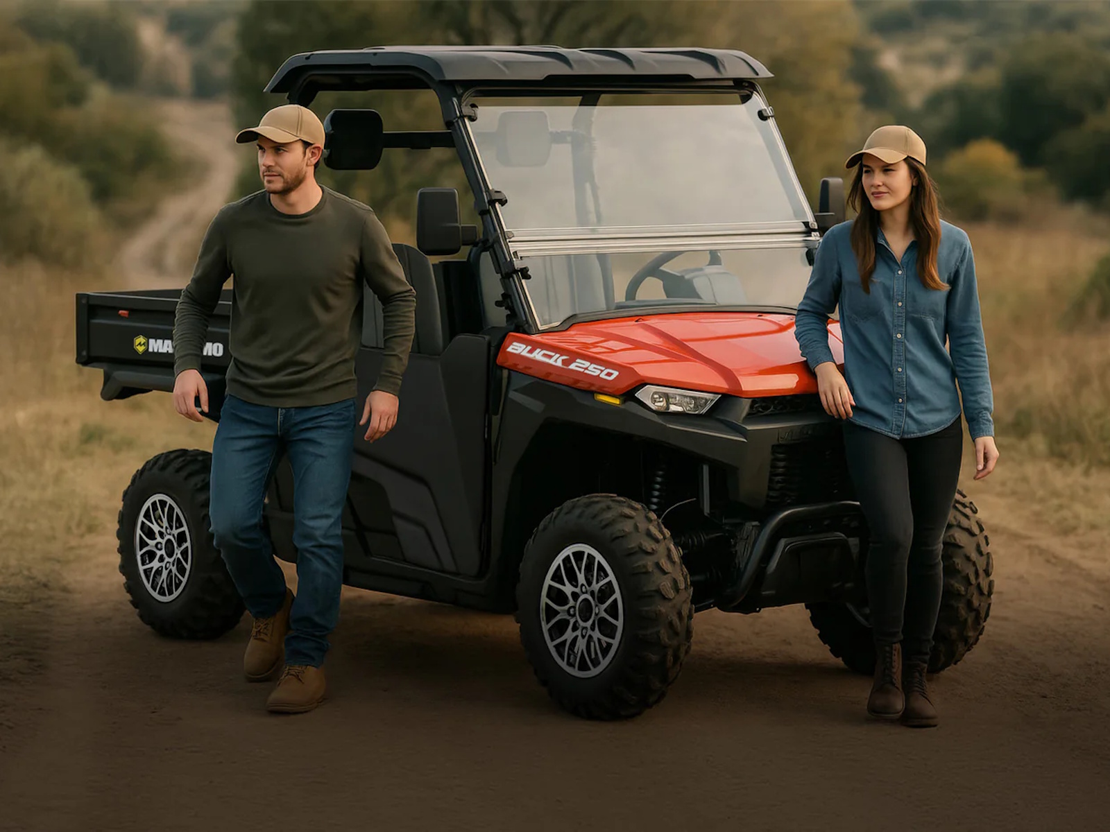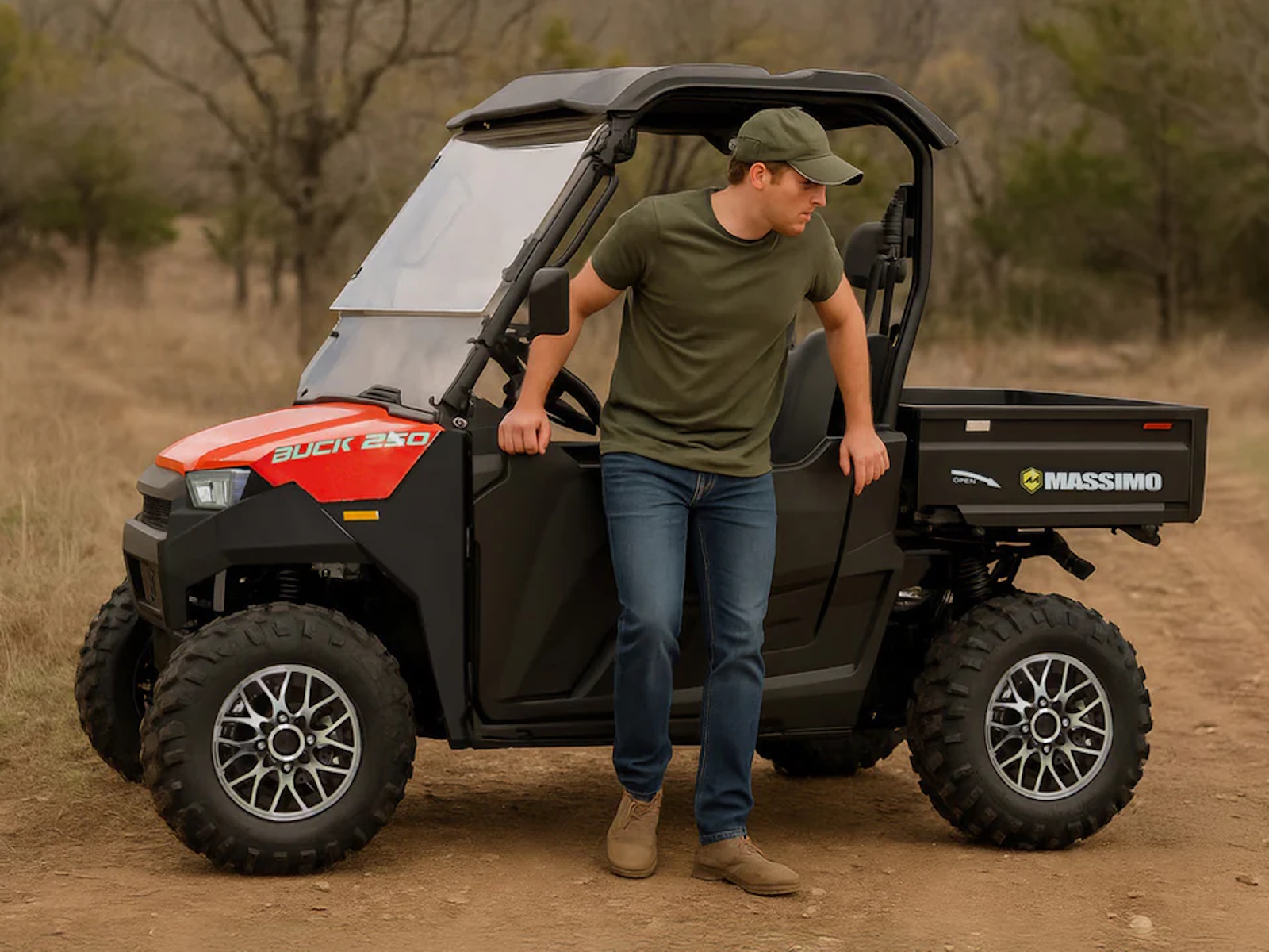 The Massimo Buck 250 is the perfect compact UTV for managing your property and enjoying light-duty adventures. Powered by a reliable and efficient 177cc EFI engine, it provides consistent, easy starting and plenty of pep for daily chores.1 Its agile and compact frame allows it to navigate tight spaces where larger machines can't go. Standard features like a hard top roof, a folding windshield, and a versatile dumping cargo bed that holds over 400 lbs make the Buck 250 an unbeatable value and the ultimate tool for your land.