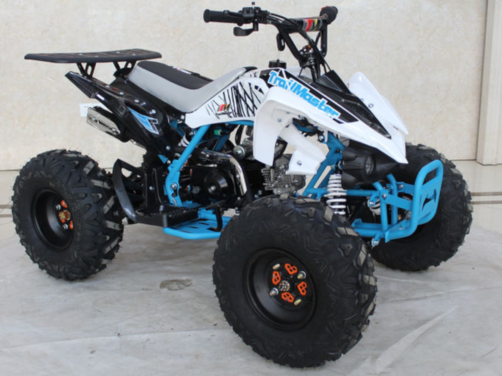 Check out the K125U Mid-Size 125cc Utility ATV for kids and you will be impressed with the quality and detail of this quad. The K125U boasts the same great features found on much more expensive name brand ATVs, like rear hydraulic disc brakes, front drum brakes, a full suspension, powerful 125cc, 4-stroke engine with CDI ignition and electric start for smooth and steady running. Plus this sporty kids ATV comes complete with a rear rack, front and rear lighting and more! The automatic transmission is controlled from an easy access foot shifter for simple maneuvering between forward, neutral and reverse. A tough chain drive and big, aggressive all-terrain tires round out the goodies on this 4-wheeler.