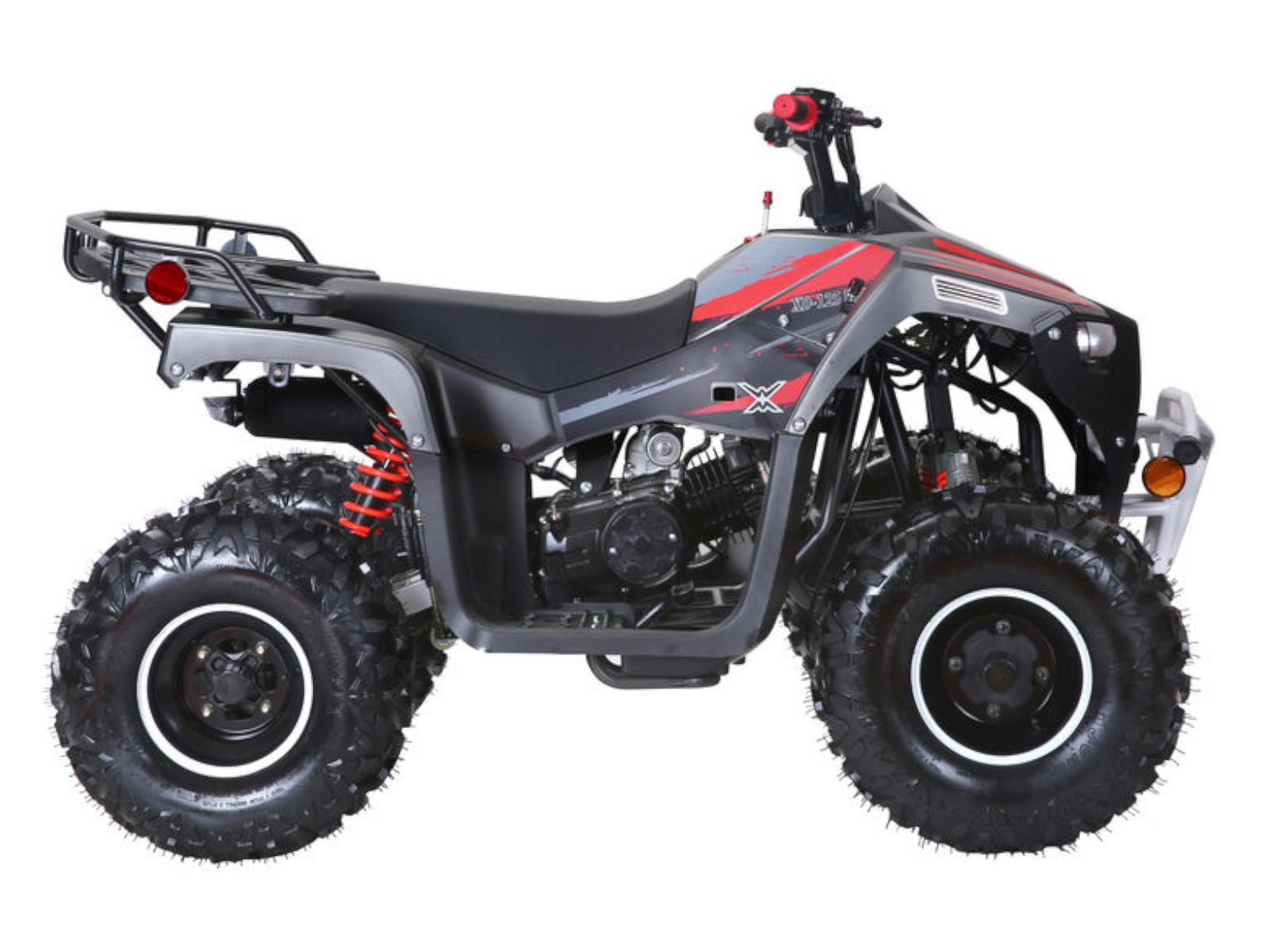 Check out the XD 125UF Mid‐Size 125cc Utility ATV for kids and you'll be impressed with the quality and detail of this quad. The XD 125UF boasts the same great features found on much more expensive name brand ATVs, like rear hydraulic disc brakes, front drum brakes, a full suspension, powerful 125cc, 4‐stroke engine with CDI ignition and electric start for smooth and steady running. Plus this ATV comes complete with utility racks, front and rear lighting and more! A 4 speed transmission is connected to a tough chain drive and big, aggressive all‐terrain tires round out the goodies on this 4‐wheeler.