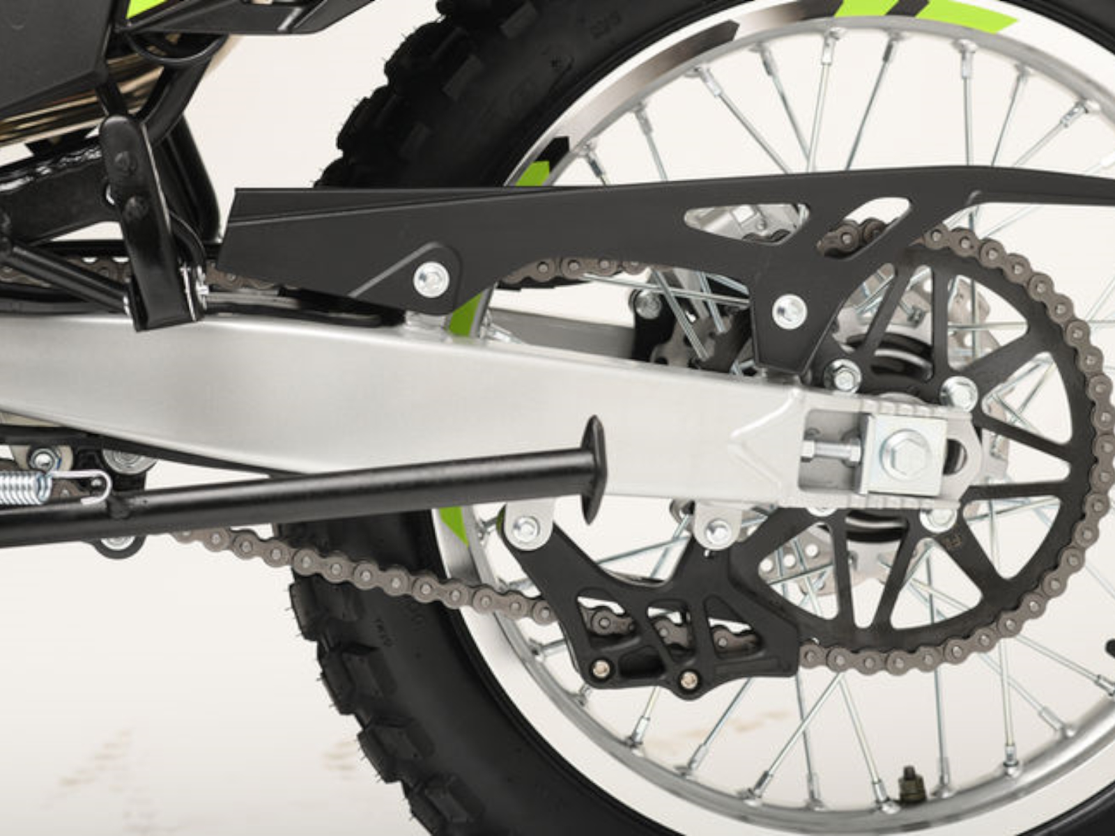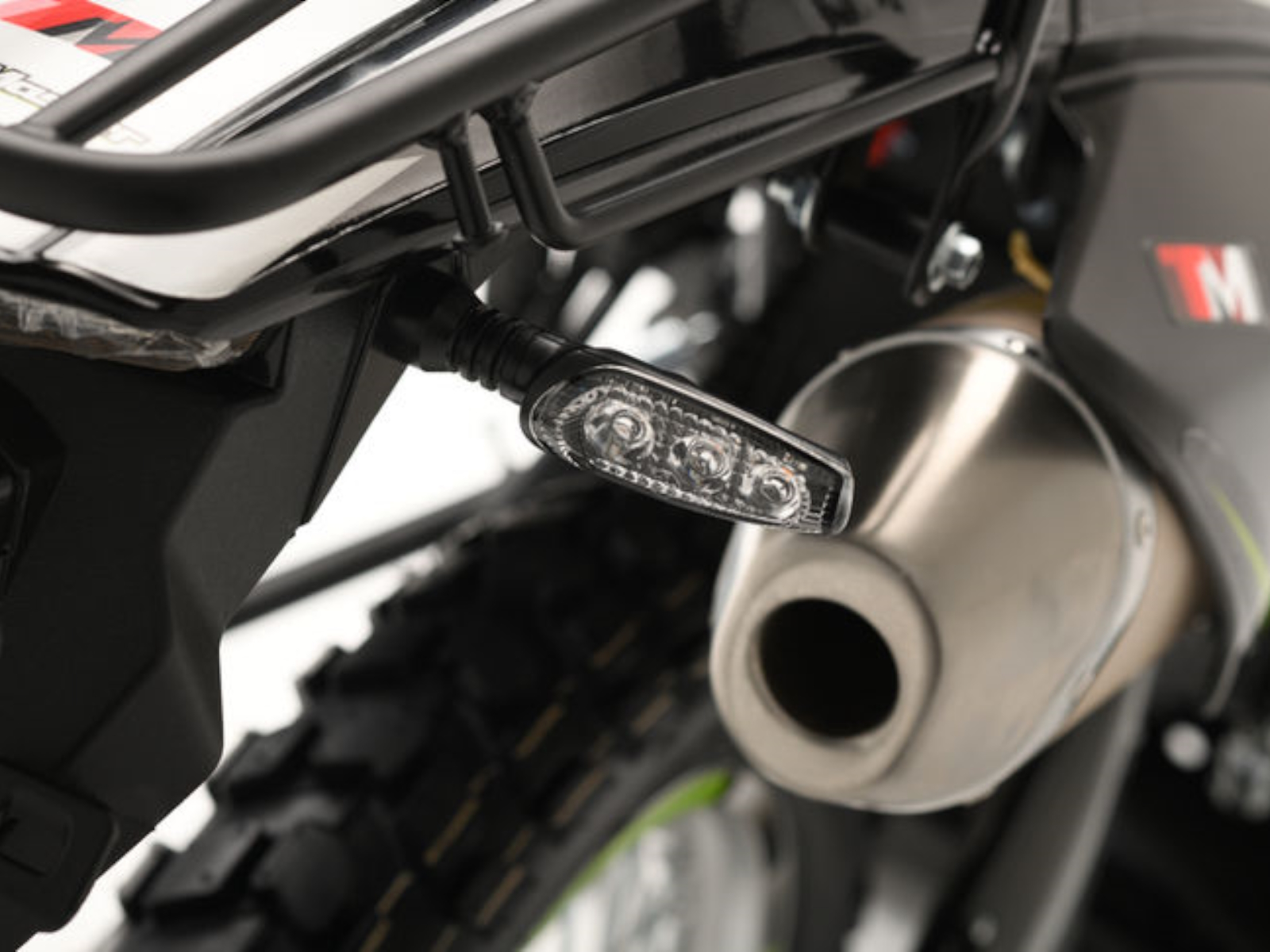 The TM T5‐250 is a great ECONOMY full size (DUAL SPORT) dirt bike. It is has both a kick start and a “ELECTRIC START”. It has a high performance 223cc 4 stroke 16hp engine with kick start and a top speed of around 57 MPH and a seat height of 35.7”. The T5 features a 5 speed manual transmission with front & rear disc brakes, inverted front shock, and a lightweight steel tube frame! This is sure to be a HOT seller! The bikes full on motocross ergonomics with a 21” front / 19” rear wheel and race suspension system, make handling feel natural and unforced, and help it navigate over almost any type of terrain. The Headlight, Digital Dashboard, Rear View Mirrors, Turn Signals, horn, license plant mount and brake lights comes standard on the T5. Electronic Digital CDI ignition makes key and kick starting effortless, keeps the bike running smoothly in all gears and provides a broad, even power band. And at only 259 pounds, the 223cc engine can propel the motorcycle to speeds of more than 57 miles per hour. Contact STATE & LOCAL DMVs about your areas specific registering requirements.