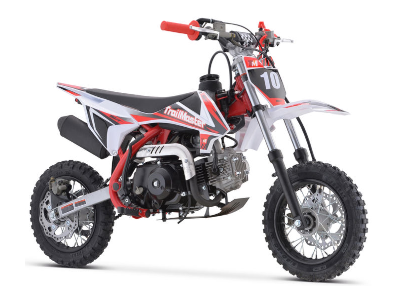 The TM 10‐110 (SEMI‐AUTO) is a great Junior size dirt bike. It has a high performance 110cc 4 stroke 6 hp engine with kick start and a top speed of around 35 MPH and a seat height of 24”. It is available in red, blue, green, and orange colors. The TM10 features a 4 speed SEMI‐Automatic transmission with front and rear disc brakes, 10” front & Rear Tire and a heavy duty frame built for durability! This is sure to be a HOT seller!