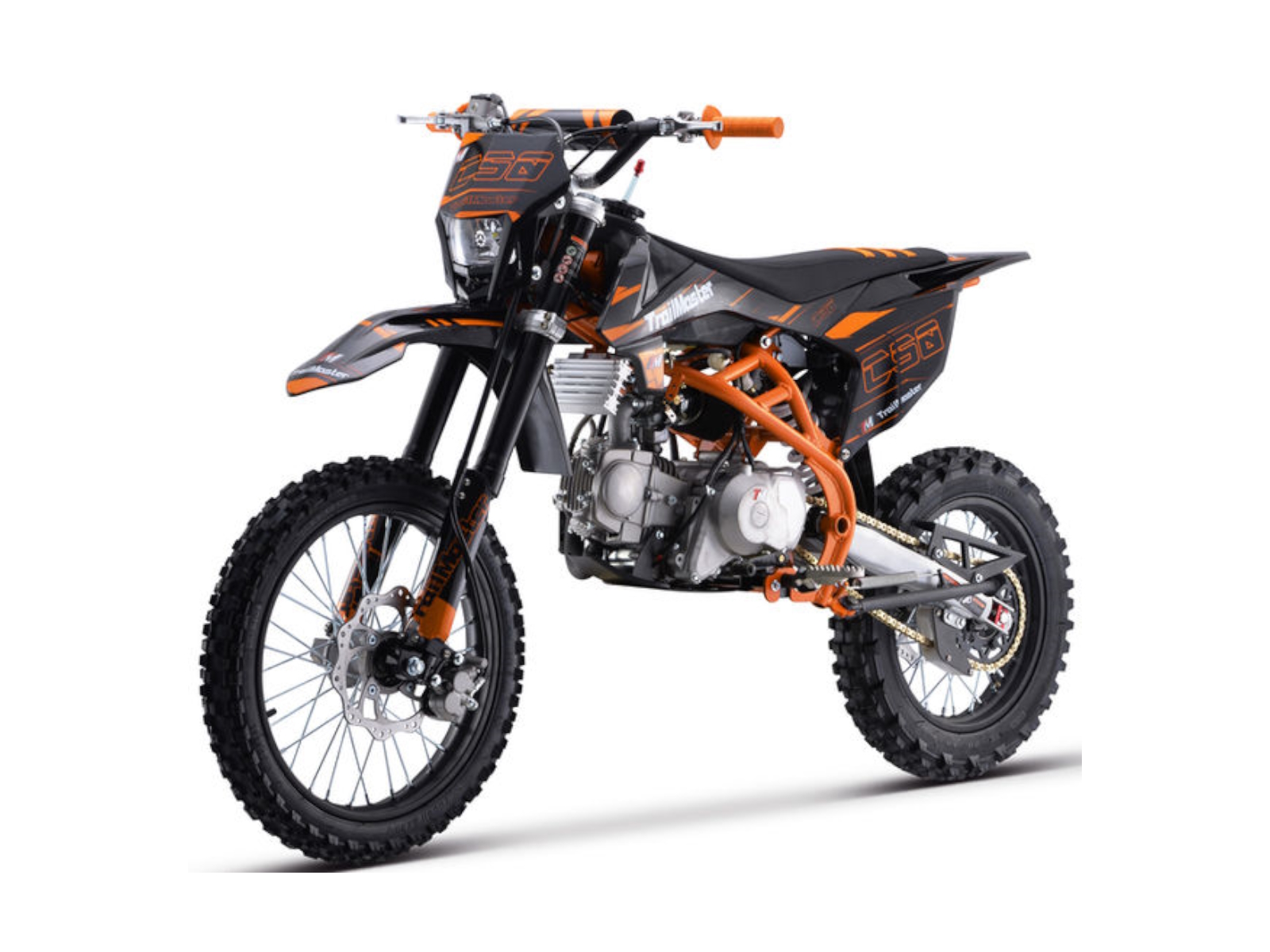 The TM C50 is a great mid size dirt bike. It has a high performance 145cc 4 stroke 9.1hp engine with electric & kick start and a top speed of around 55 MPH and a seat height of 33.5”. It is available in red, green, and orange colors. The TM C50 features a 4 speed manual transmission with front and rear disc brakes, and inverted front shocks! This is sure to be a HOT seller! The bikes full on motocross ergonomics and race suspension system make handling feel natural and unforced, and help it navigate over almost any type of terrain. Electronic CDI ignition makes kick starting effortless, keeps the bike running smoothly in all gears and provides a broad, even power band. And at only 172 pounds, the 145cc engine can propel the motorcycle to speeds of 55 miles per hour.