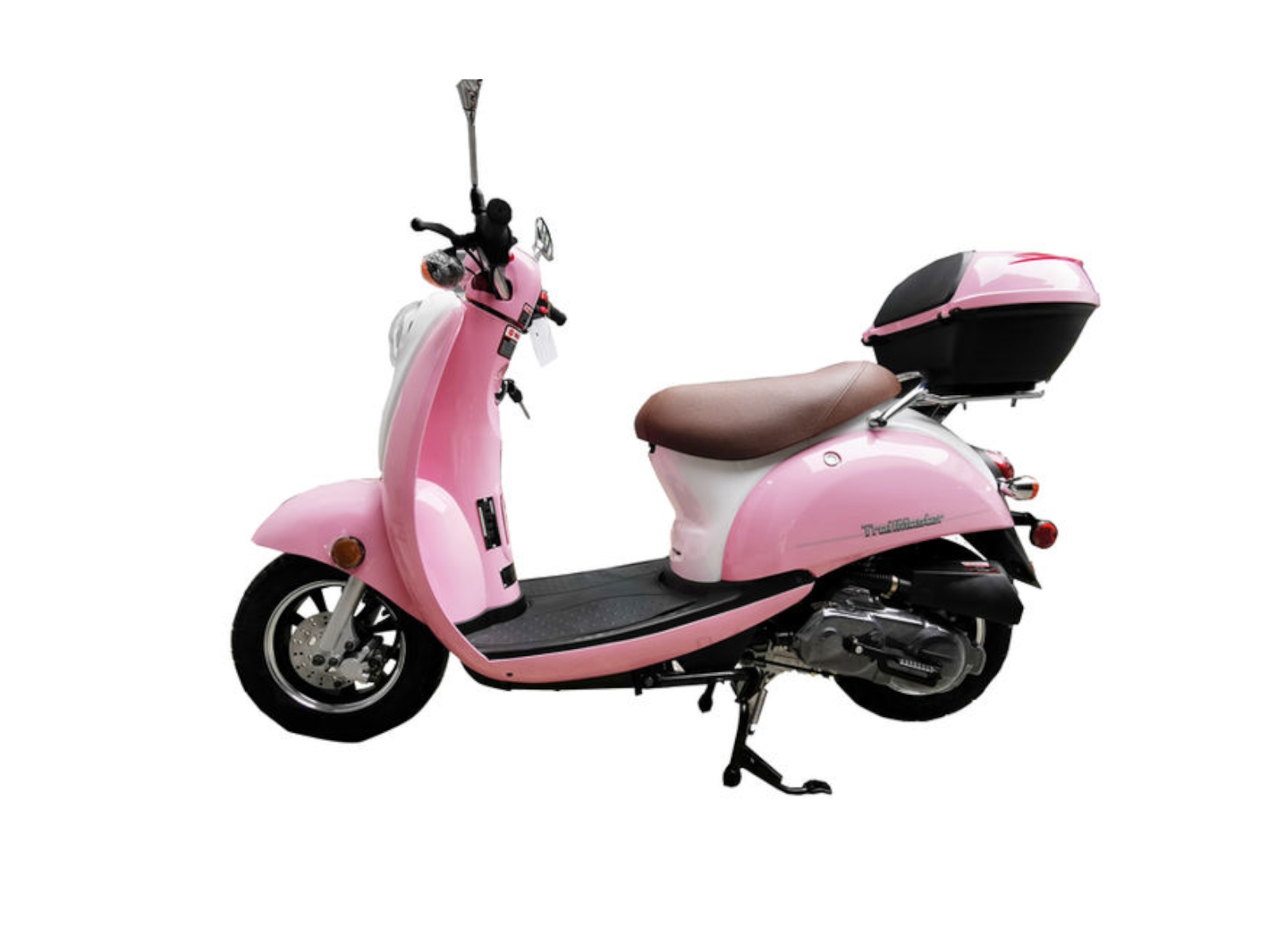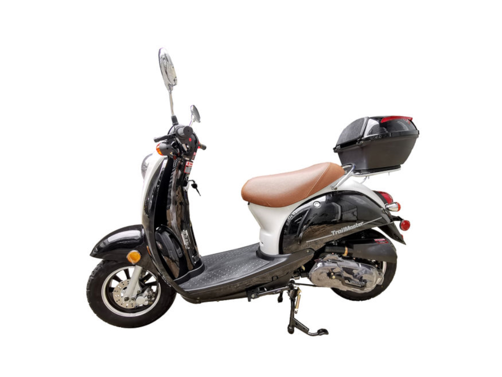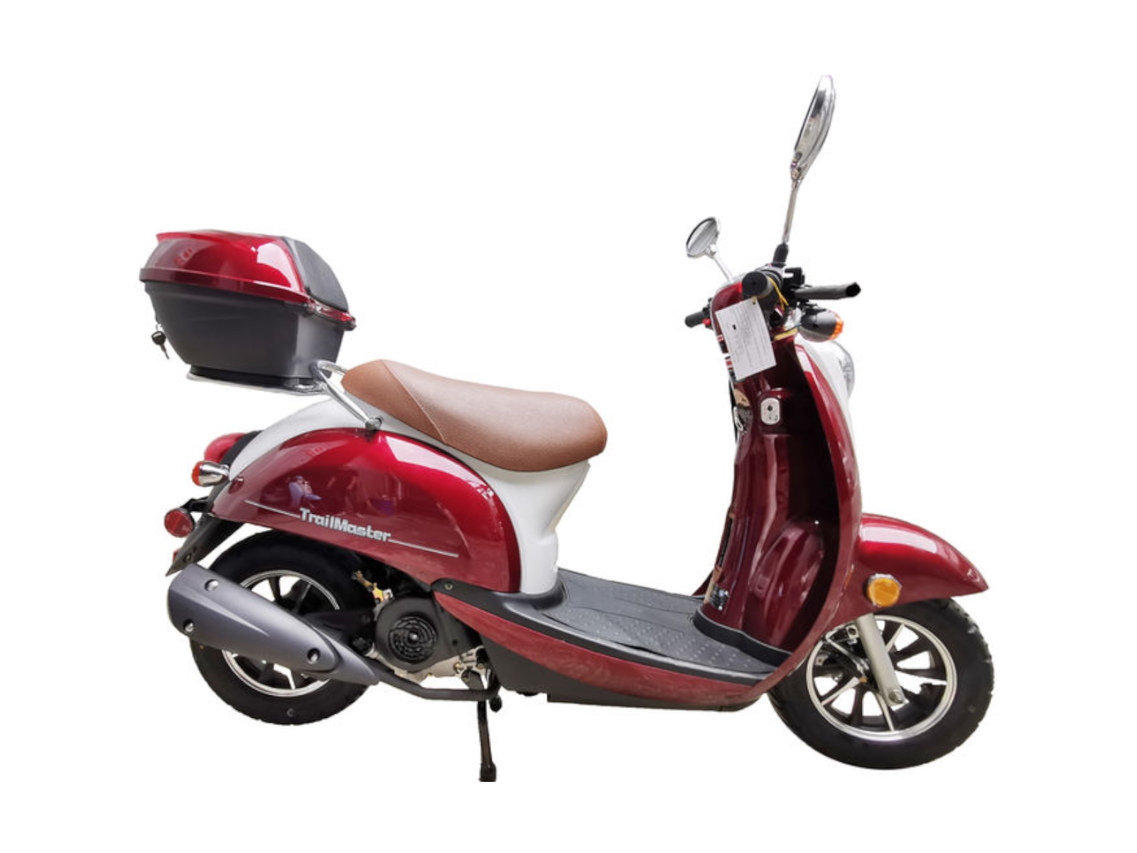 The all new TrailMaster Milano 50N scooter brings scooter styling to everyone! The Milano 50N features a tough little 50cc engine and smooth running automatic CVT transmission with enough power to handle quick trips around the neighborhood and local city streets at speeds up to 30 miles per hour! Not only do you get big, 10 inch mag style steel wheels for great handling, but the Milano also comes standard with a front disc brake for effortless stopping power. But this little scooter is not just all mechanics. It sports some pretty neat design features, too, like a luxury leather seat, LED turn signals, stylish rear view mirrors and generous chrome trim give this moped that extra touch! Comes fully assembled! Electric start. Several colors!