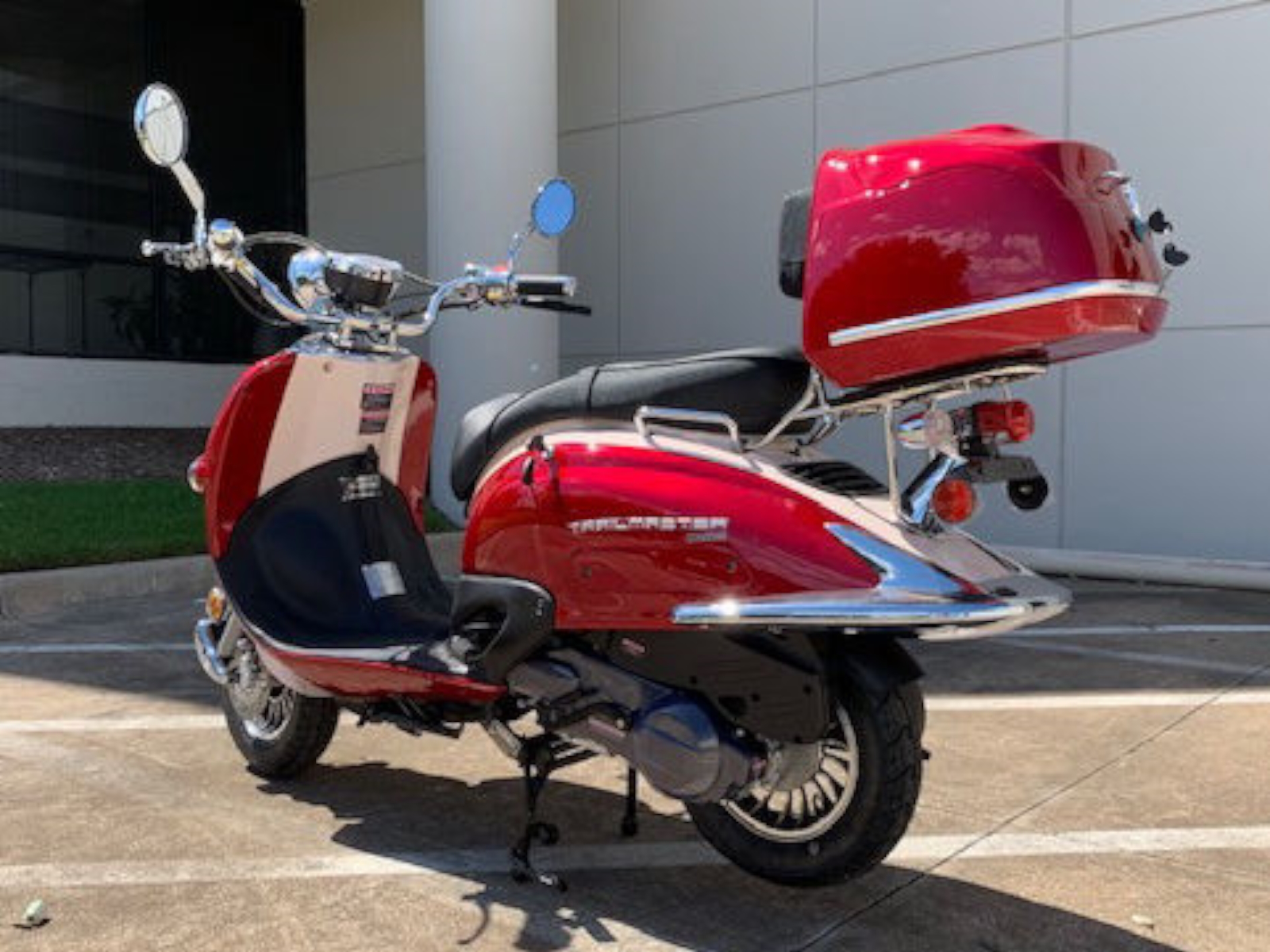 The Sorrento 150A has a fantastic two tone retro stylish look, matched color rear trunk, high quality chrome review mirror and etc. This model comes with a 150cc (8.7hp) engine w/ kick and electric start that has a max speed of 51 mph! Matching rear luggage trunk for books and supplies…this model is perfect for the college kid or for anyone to speed around town! Best of all, it comes with 1 year 10,000 miles engine warranty!