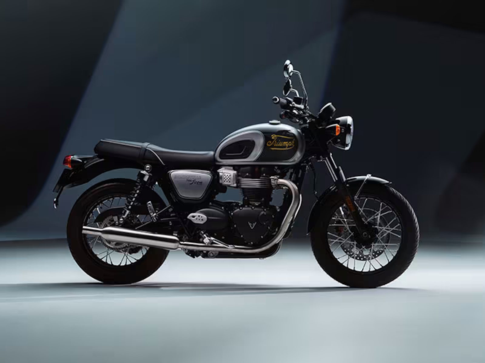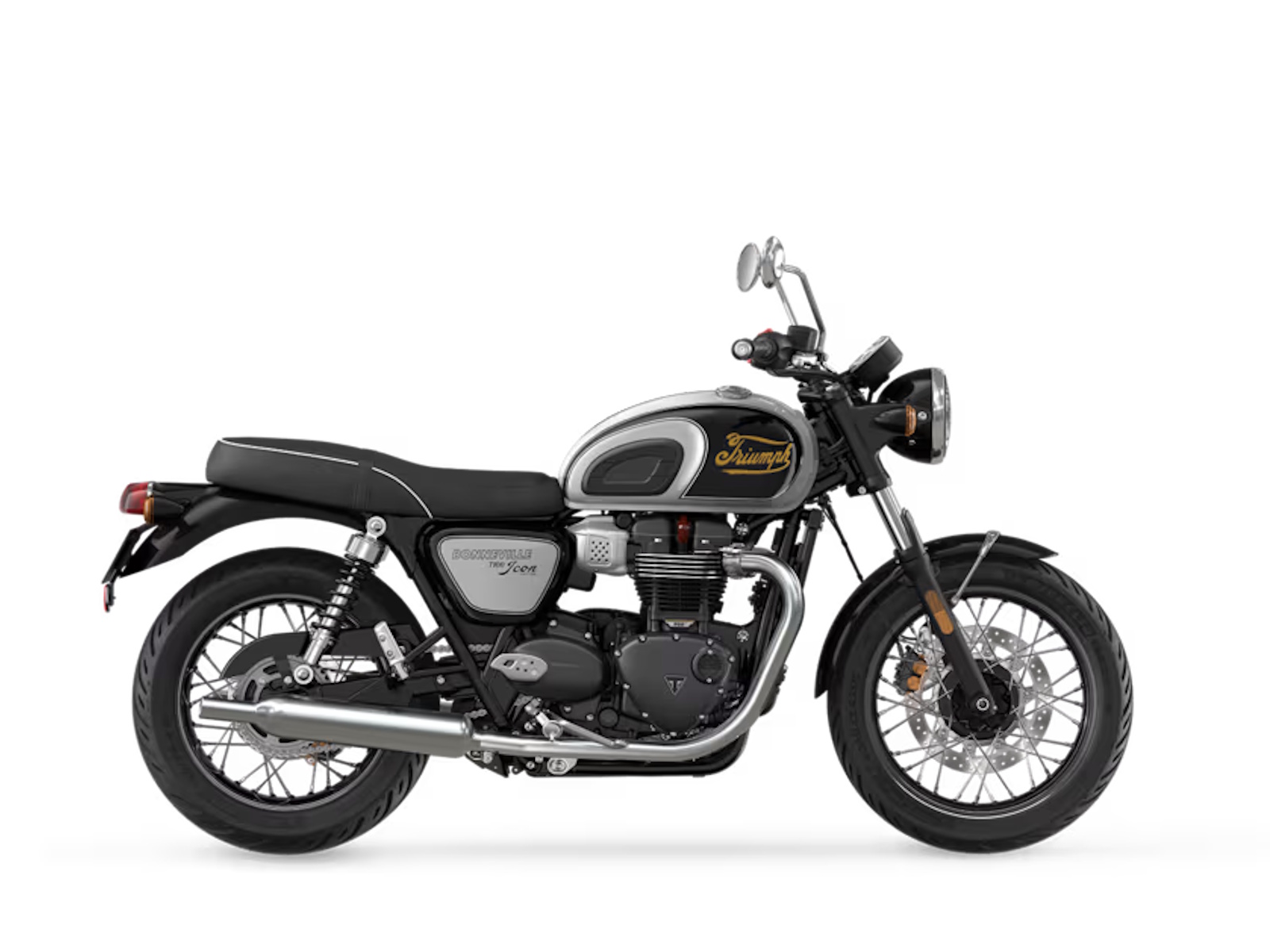 The new Bonneville T100 Icon Edition, presented in a refined Aluminum Silver / Sapphire Black paint scheme, captures the spirit of a British classic with a modern touch. The Aluminum Silver finish is enhanced by deep Sapphire Black accents on the tank and side panels. Hand-painted coach lining and a gold Triumph 1907 script logo complete the look, ideal for those who appreciate timeless style with a modern edge.