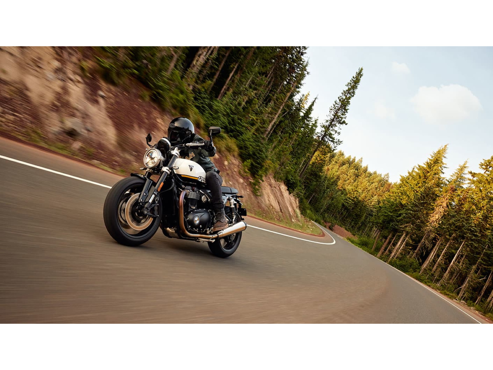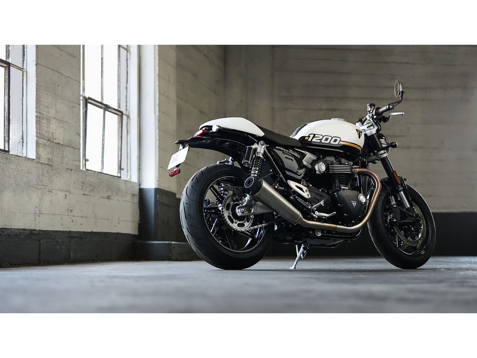 Stunning and uncompromising, the Speed Twin 1200’s sleek, minimal design has evolved. The raked fuel tank, with its deep front cutouts, is chiseled and muscular, while the minimal throttle body covers are finished in brushed aluminum and integrated seamlessly into sculpted side panels within the slim rear frame. Underneath, the lean, angular engine casings are powder-coated black and framed by an uninterrupted exhaust run flowing into twin upswept ‘megaphone’ silencers.